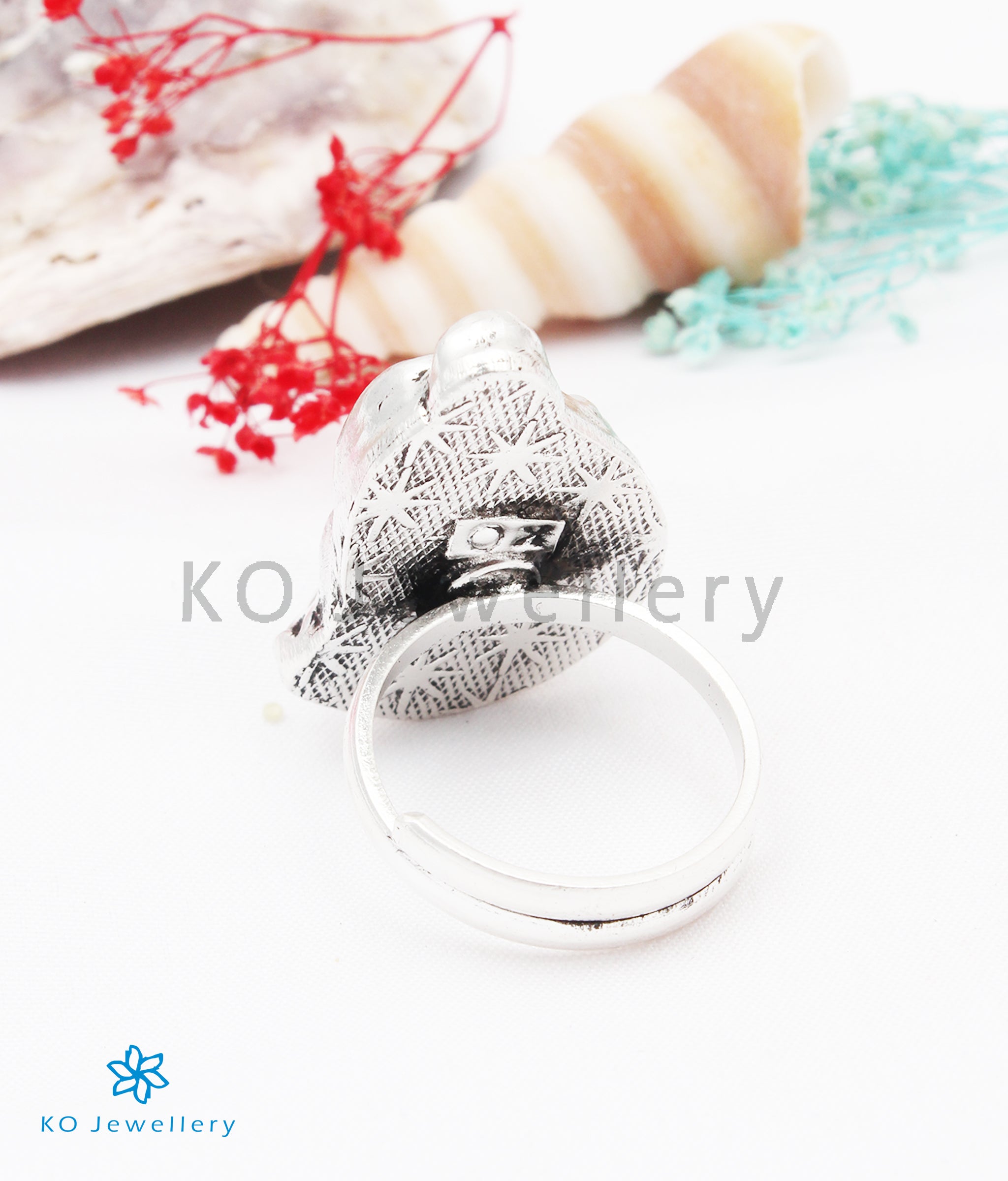 Inspired by the ancient art of South Indian temple jewellery, this exquisite ring is meticulously crafted using the centuries-old nakkasi or gilt & repousse technique, ensuring each detail is flawlessly executed.