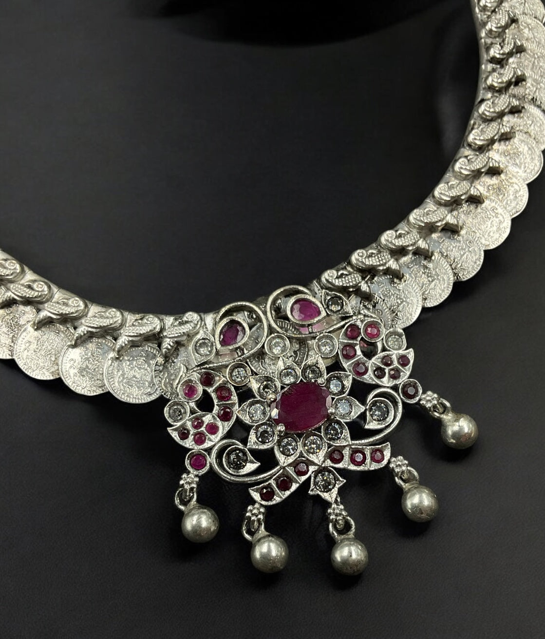 The Mohini Silver Peacock Kasumala Necklace (Oxidised)