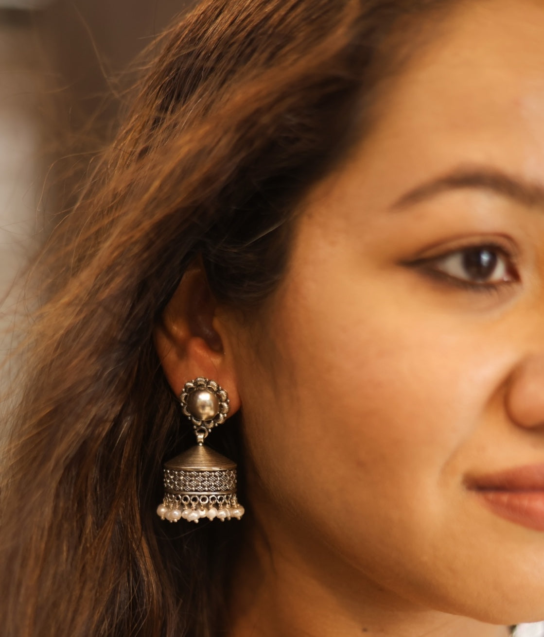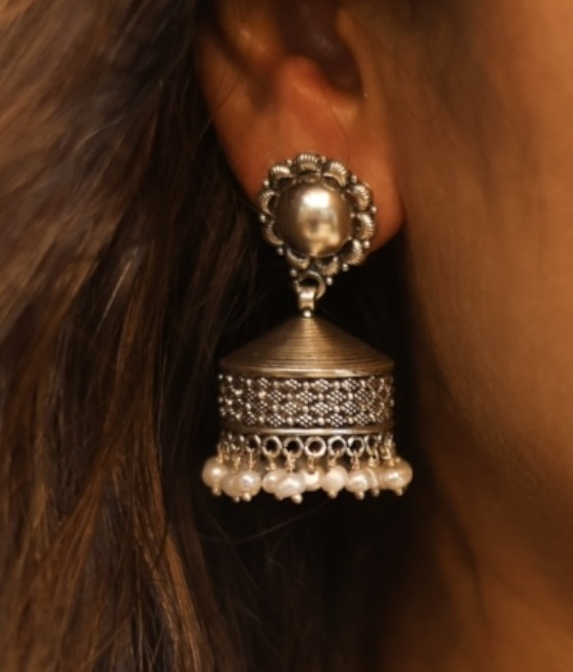 The Pradhva Silver Filigree Pearl Jhumka