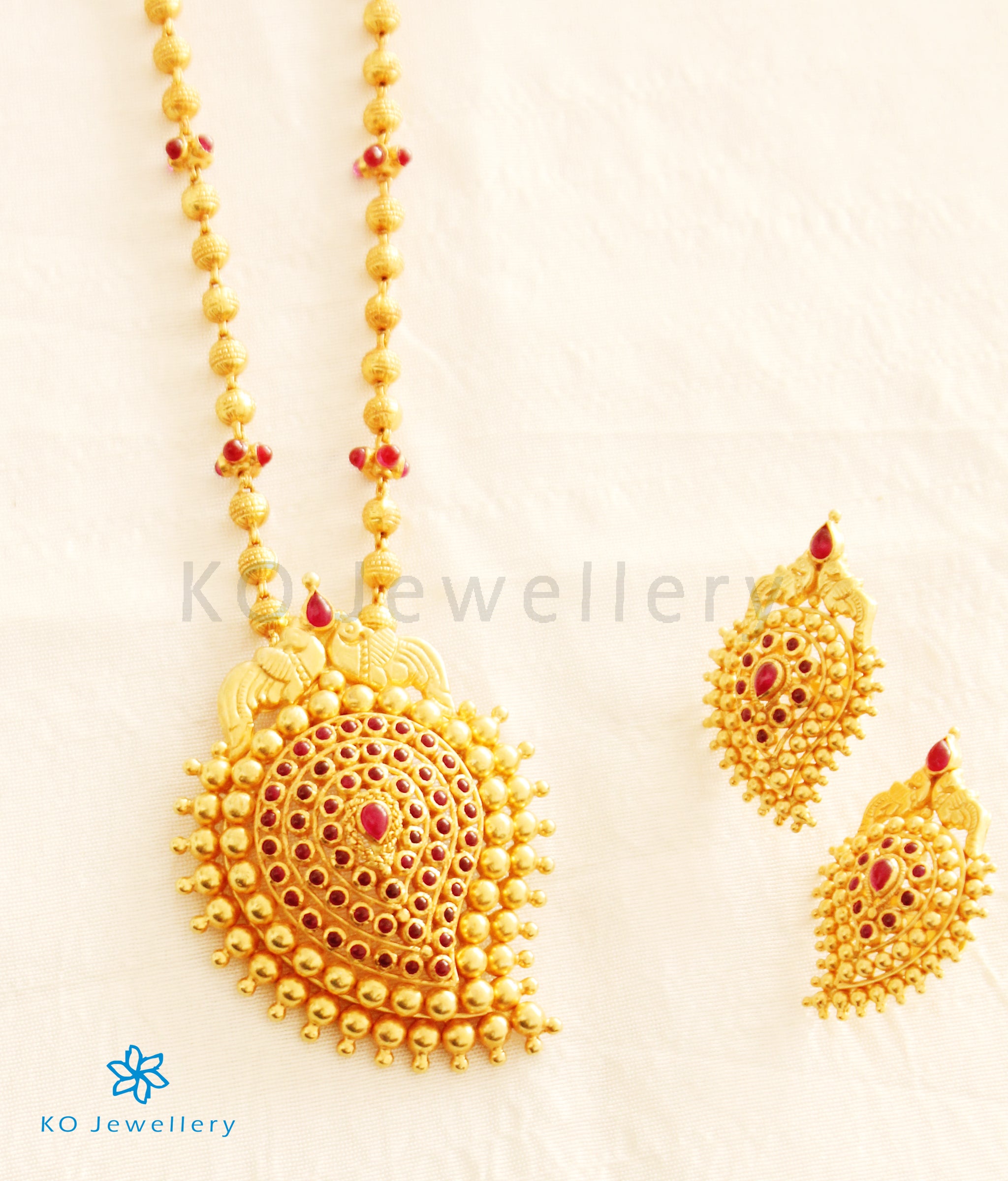 Amazingly graceful and essentially ethnic this necklace made up of gold-dipped, silver beads ( which have a unique ribbed design or grooves) and is a traditional centuries old ornament worn by women in south India. The ornate paisley shaped pendant is topped by twin peacocks and decorated with kempu stones.It is paired with matching earrings. The entire piece is handcrafted in Sterling Silver (92.5%) and gold-dipped in a special process.