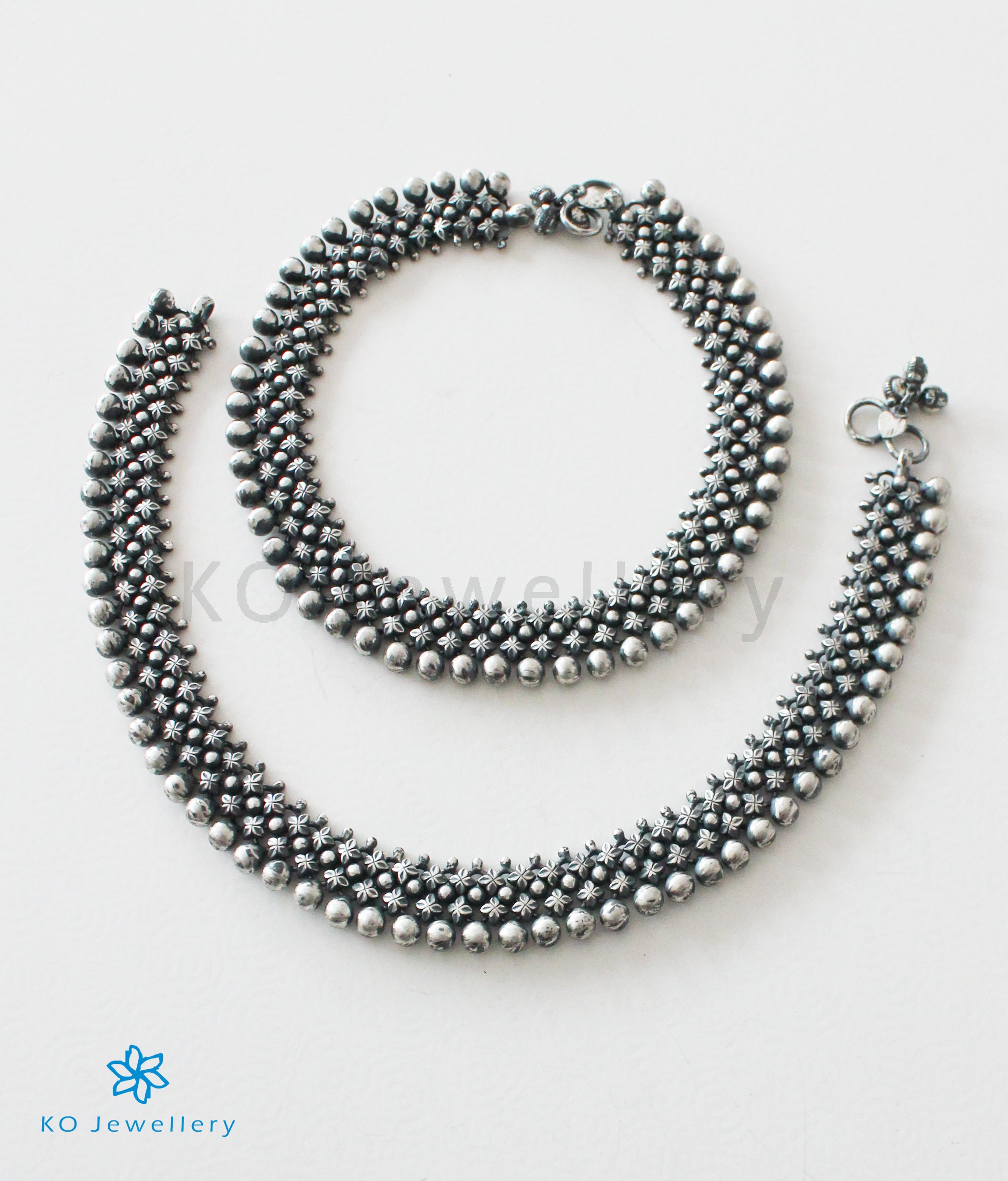 An ornate pair of anklets, skillfully handcrafted this piece of jewellery is truly awe-inspiring! All the minute, pieces that make up the anklets are crafted separately and then joined together with silver clasps.Crafted in Sterling Silver (92.5%) the elaborate design of the anklets is extremely attractive .A perfect pair for a bride's feet.