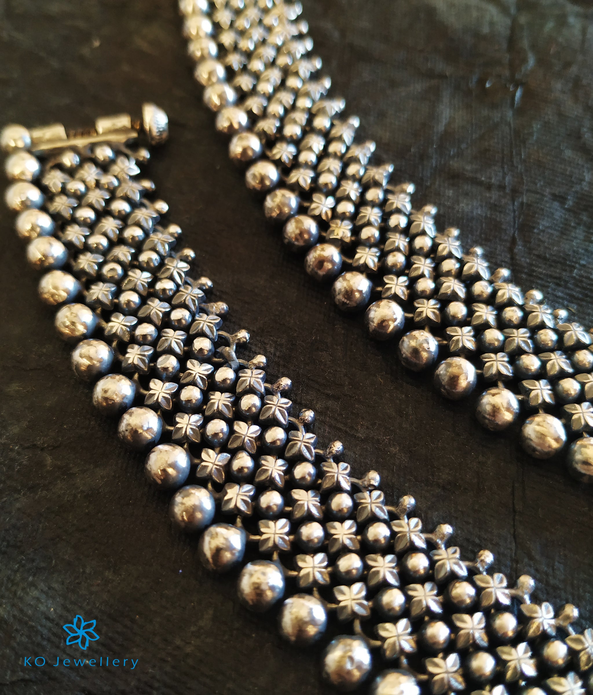 An ornate pair of anklets, skillfully handcrafted this piece of jewellery is truly awe-inspiring! All the minute, pieces that make up the anklets are crafted separately and then joined together with silver clasps.Crafted in Sterling Silver (92.5%) the elaborate design of the anklets is extremely attractive . A perfect pair for a bride's feet.