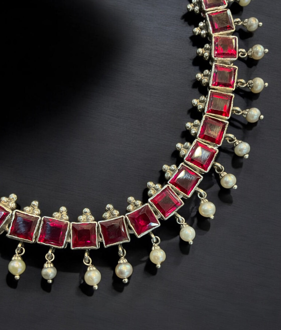 Indulge in timeless elegance with this exquisite handcrafted Sterling Silver (92.5) Square Kemp-stone Necklace & Earrings. Designed to sit gracefully close to your neck, this ornate piece is a stunning blend of tradition and artistry. The necklace features square shaped kemp stones set beautifully and adorned with beautiful Pearl .