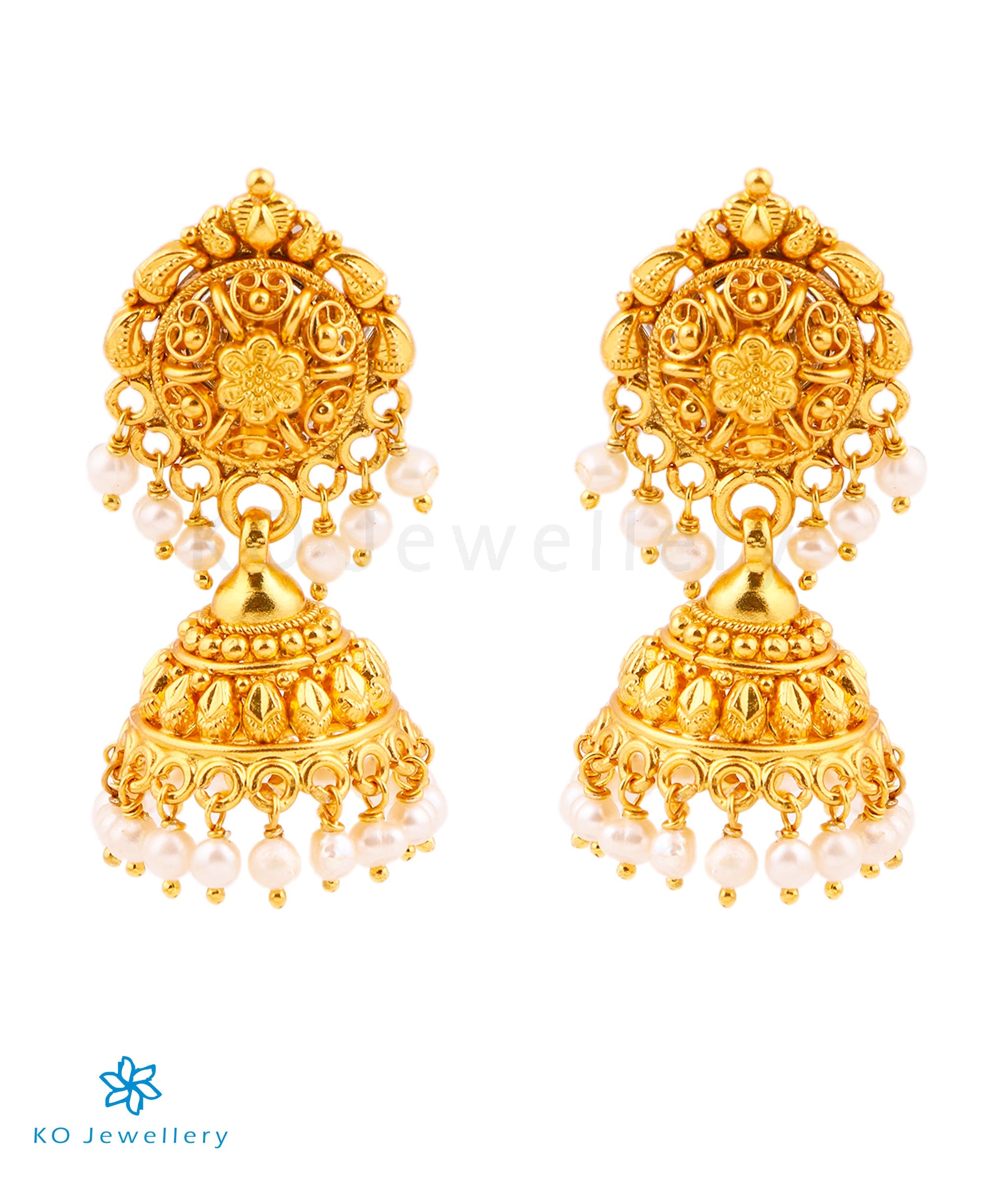 This intricate jhumka in Sterling Silver (92.5%) with pearls is a very flattering design that will add a sparkle to your outfit . A beautiful mix of tradition and Indian craftsmanship this pair has been gold-dipped to accentuate the design and comes with bombay screw closure.