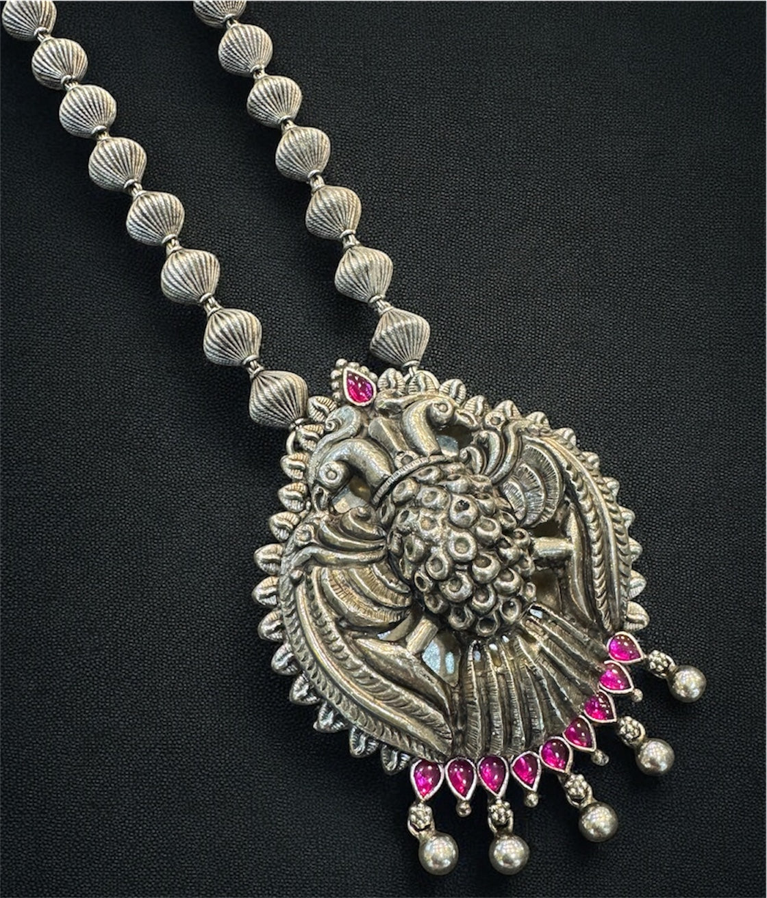 The pendant is hung on a chain of handmade silver beads that serves to enhance the beauty of the piece and lend it a contemporary flair.