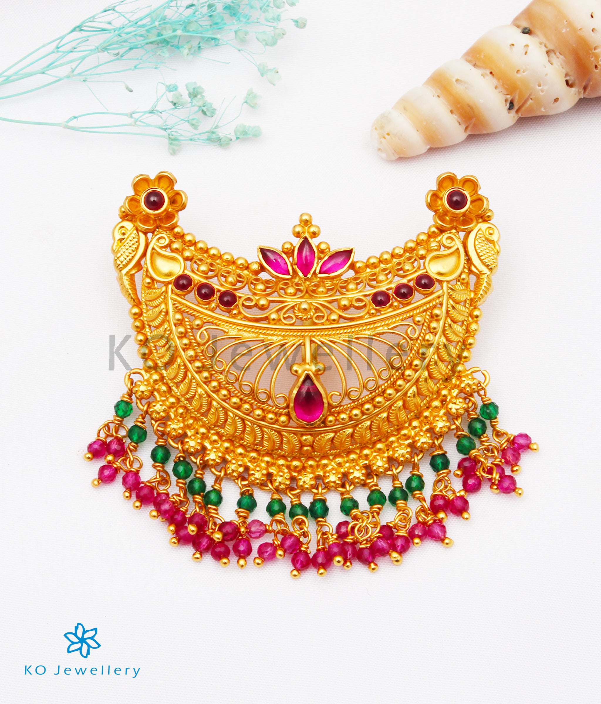 Amazingly graceful and essentially ethnic this pendant is topped by twin peacocks and decorated with kempu stones . The entire piece is handcrafted in Sterling Silver (92.5%) and gold-dipped in a special process. The rim of the pendant is fringed with red and green beads.
