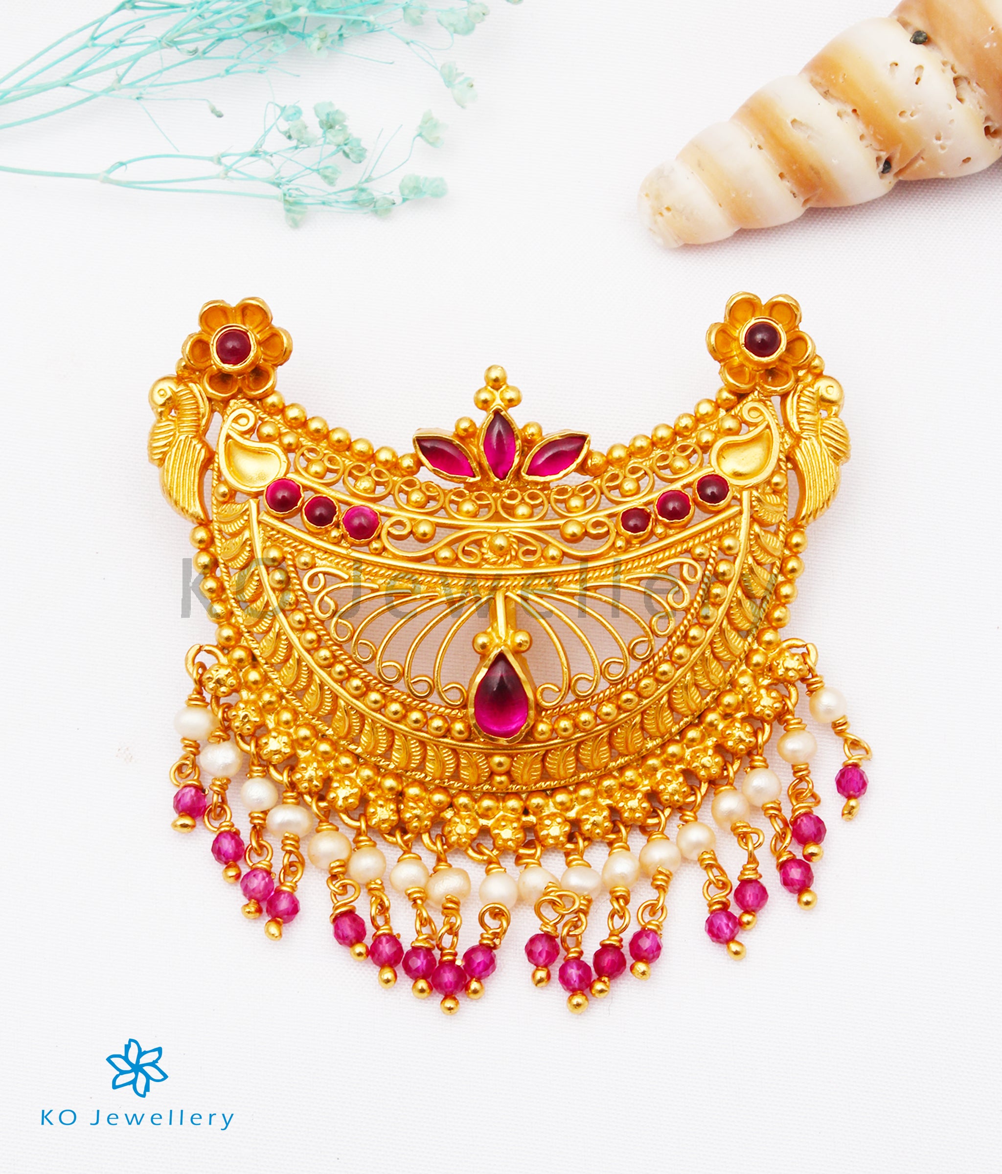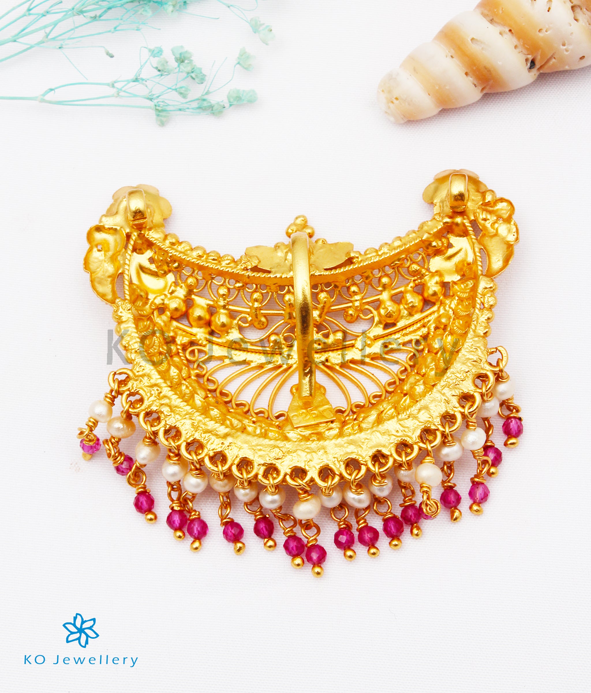Amazingly graceful and essentially ethnic this pendant is topped by twin peacocks and decorated with kempu stones . The entire piece is handcrafted in Sterling Silver (92.5%) and gold-dipped in a special process. The rim of the pendant is fringed with kemp stone beads and pearl .
