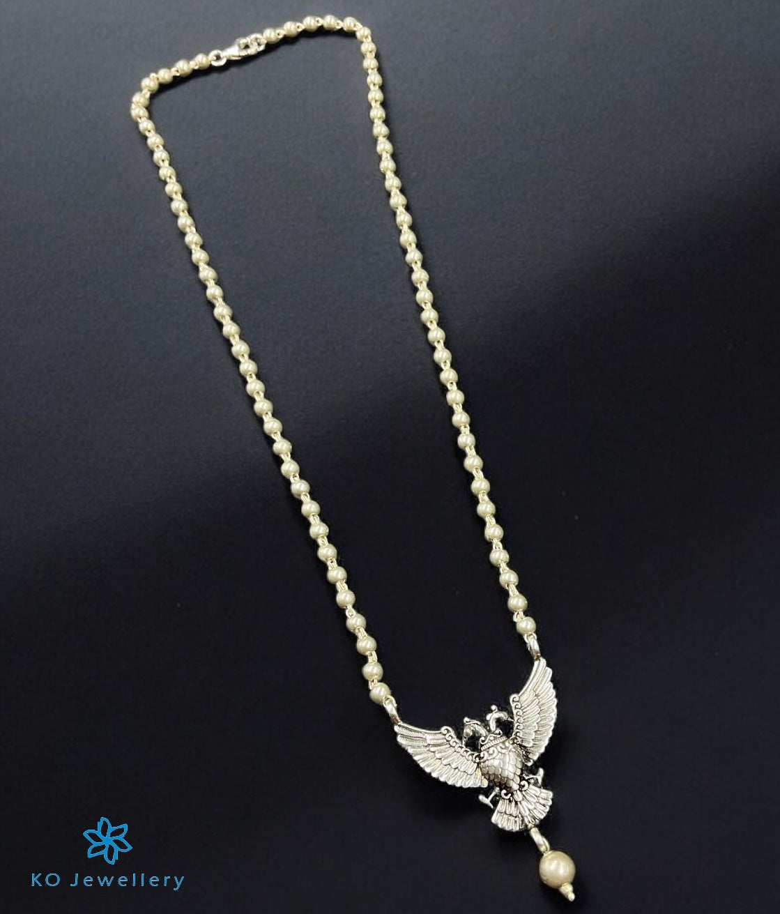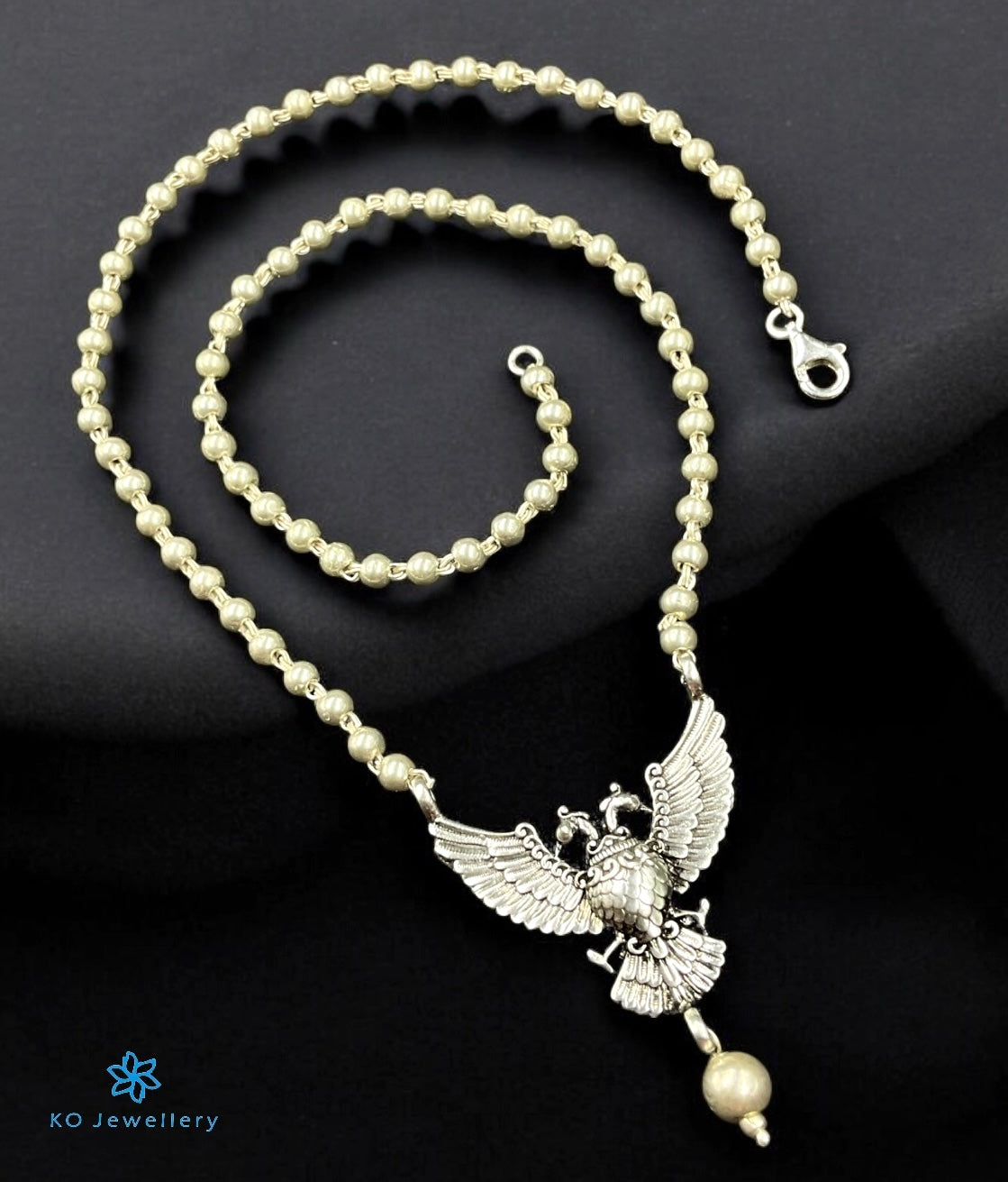 Introducing our Gandaberunda Necklace a breathtaking piece from our Antique Temple Jewellery Collection. This exquisite necklace features a central pendant of the Gandaberunda—a two-headed mythical bird from Hindu mythology, renowned for its immense magical strength and its ability to combat forces of destruction. With heads resembling the mighty eagle and a tail like the majestic peacock, the Gandaberunda symbolizes both power and resilience. The necklace string is made of pure 925 silver beads .
