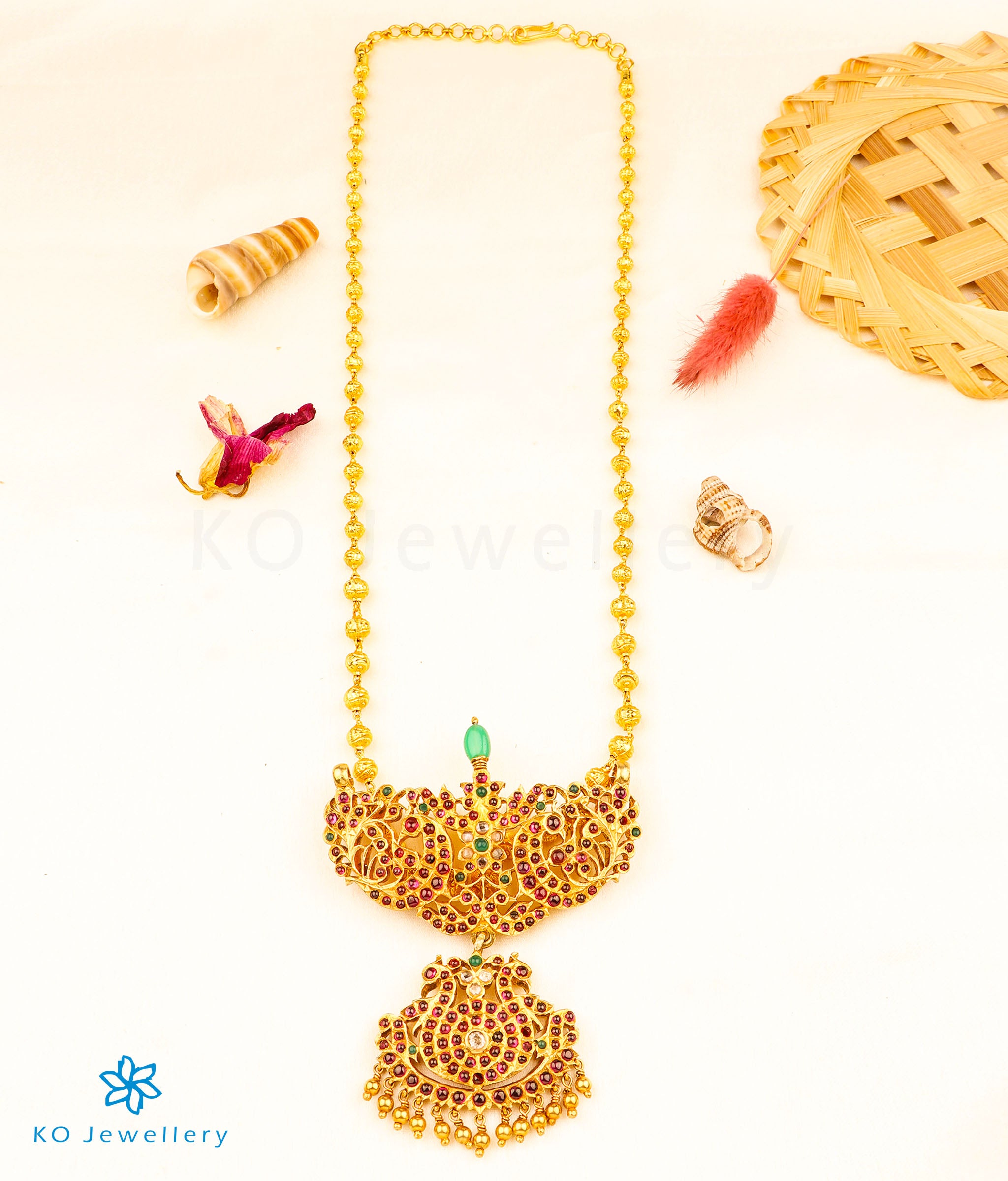 Feel like royalty when you wear this dazzling necklace in the `Makarakanti' design - a ceremonial necklace worn by kings in ancient times. The entire necklace has kemp stones which creates a beautiful visual appeal. The necklace is handcrafted in pure Sterling Silver (92.5) and gold dipped to perfection.