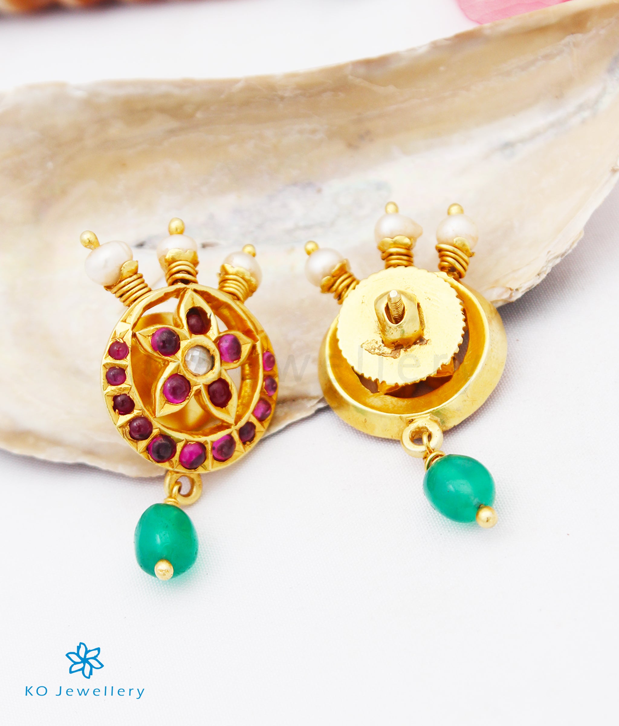 The earrings is Extremely attractive and skillfully handcrafted this sterling silver (92.5%) earrings set with `kempu' stones is simply stunning .Crafted using techniques used in ancient South Indian antique gold temple jewellery the entire piece is crafted in pure Sterling Silver (92.5%) and gold dipped to give a dark antique look.