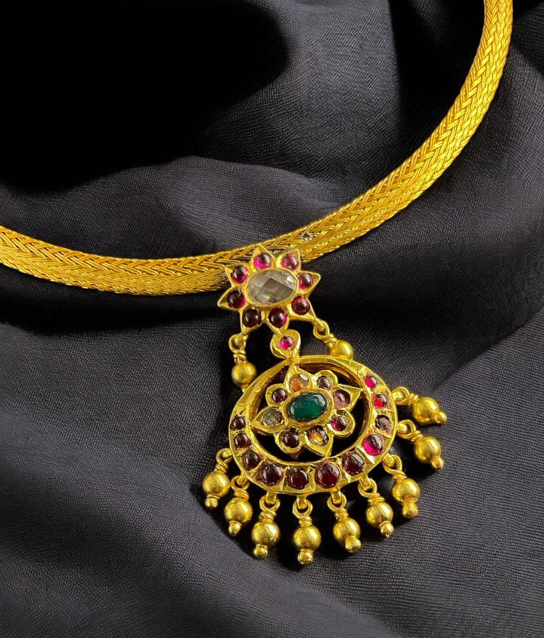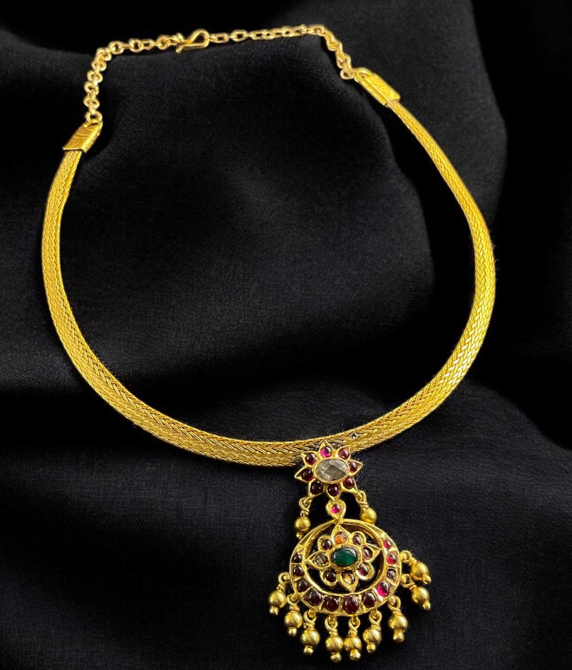 Crafted using techhniques used in ancient South Indian antique gold temple jewellery the entire piece is crafted in pure Sterling silver(92.5%) and lavishly dipped in 24K gold, the necklace boasts a rich antique finish that enhances its timeless appeal.