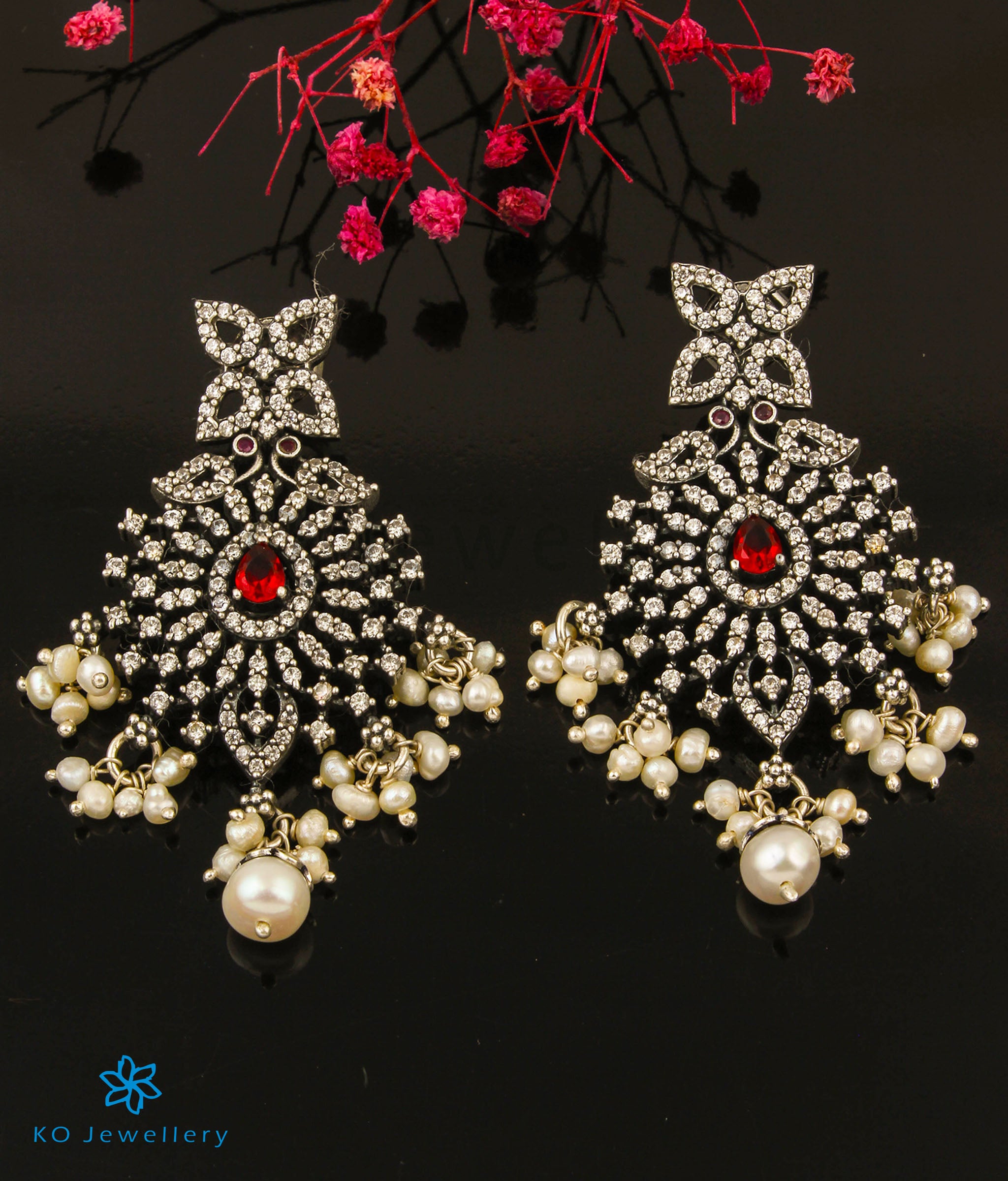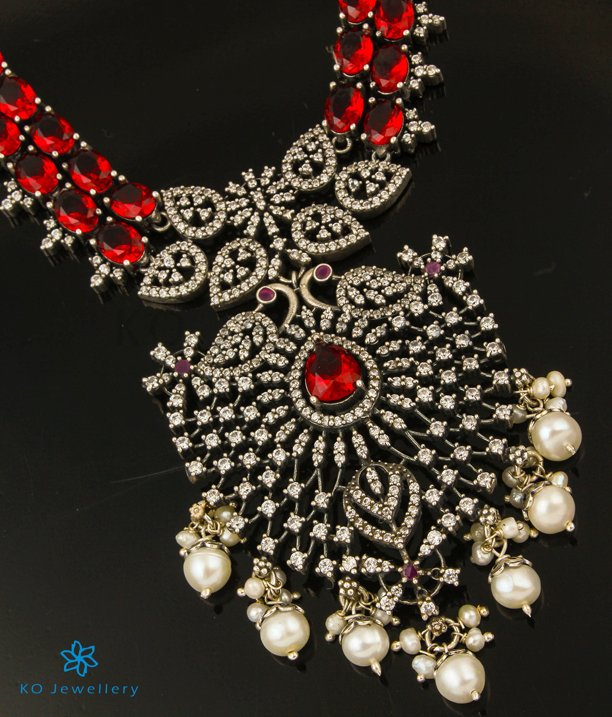 An ornate necklace with an exquisite peacock design created by using high quality AAA+, sparkling Cubic Zirconia which give a superior shine and brilliance. The blood red colour of the stones on the necklace add to the drama of the entire piece. The entire necklace is crafted in pure Sterling Silver (92.5%) and oxidised . It comes with a pair of matching earrings.The earrings come with 'bombay-screw' closure at the back.