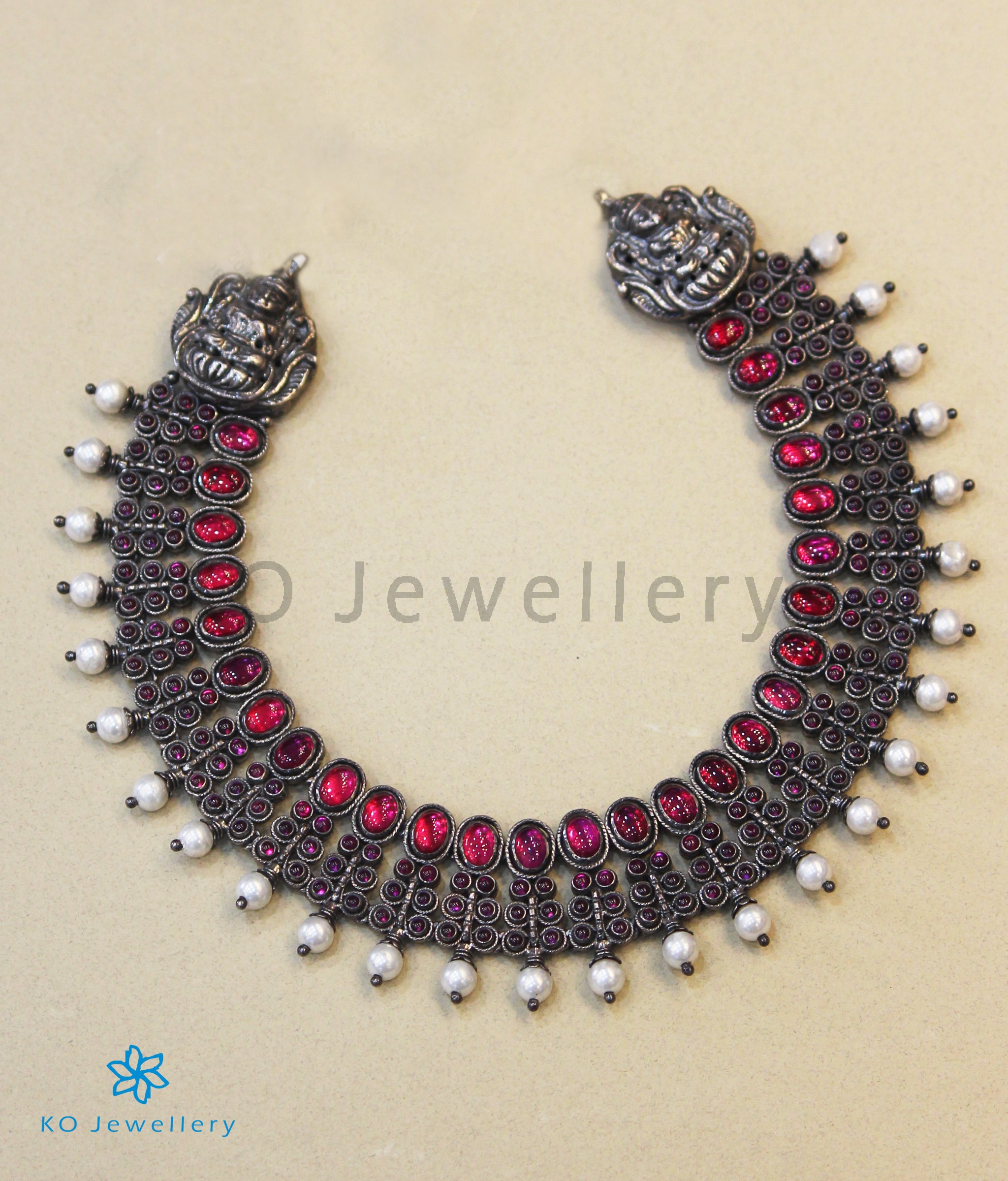 An attractive and unique piece this Sterling Silver (92.5%) necklace in a choker design is brought to life with kempu stones .Two regal Lakshmi pendants hold up the necklace on either side. This necklace is paired with matching jhumkas.