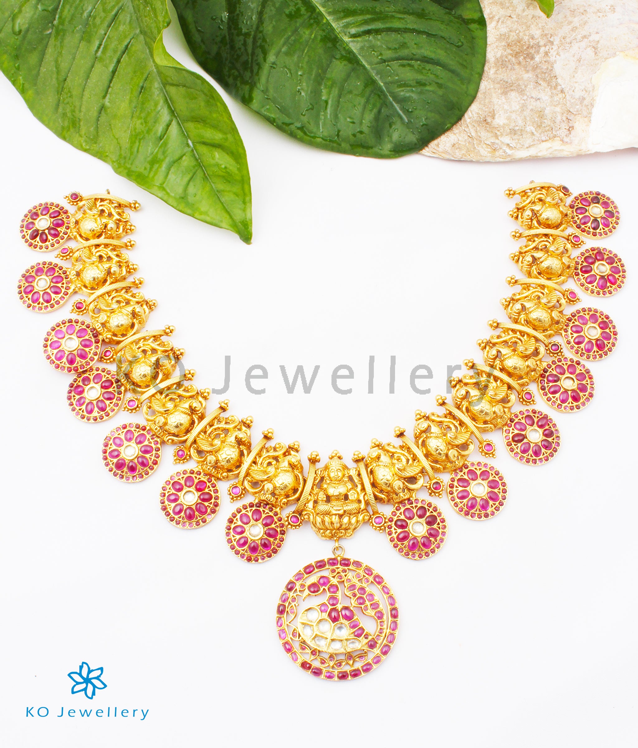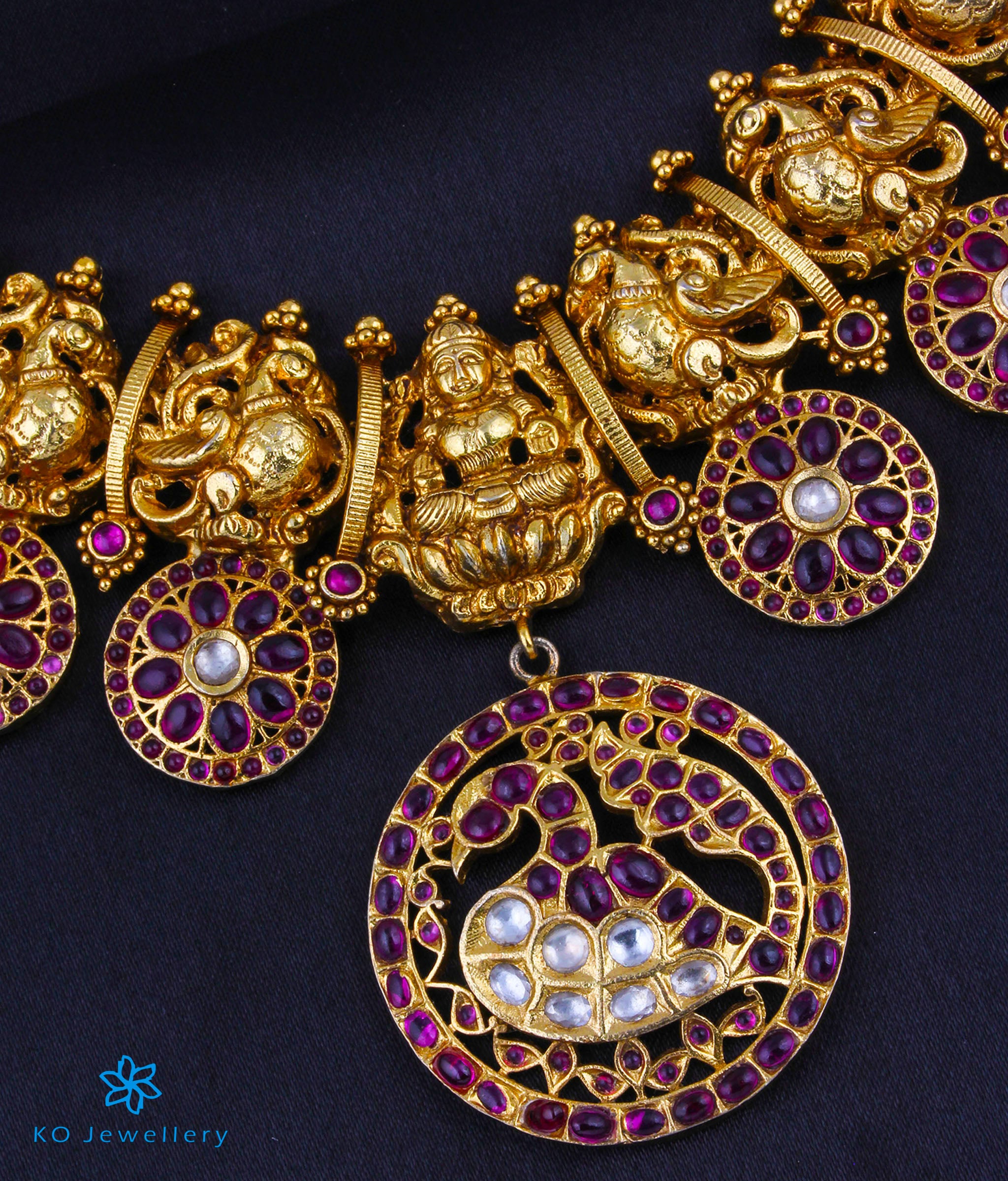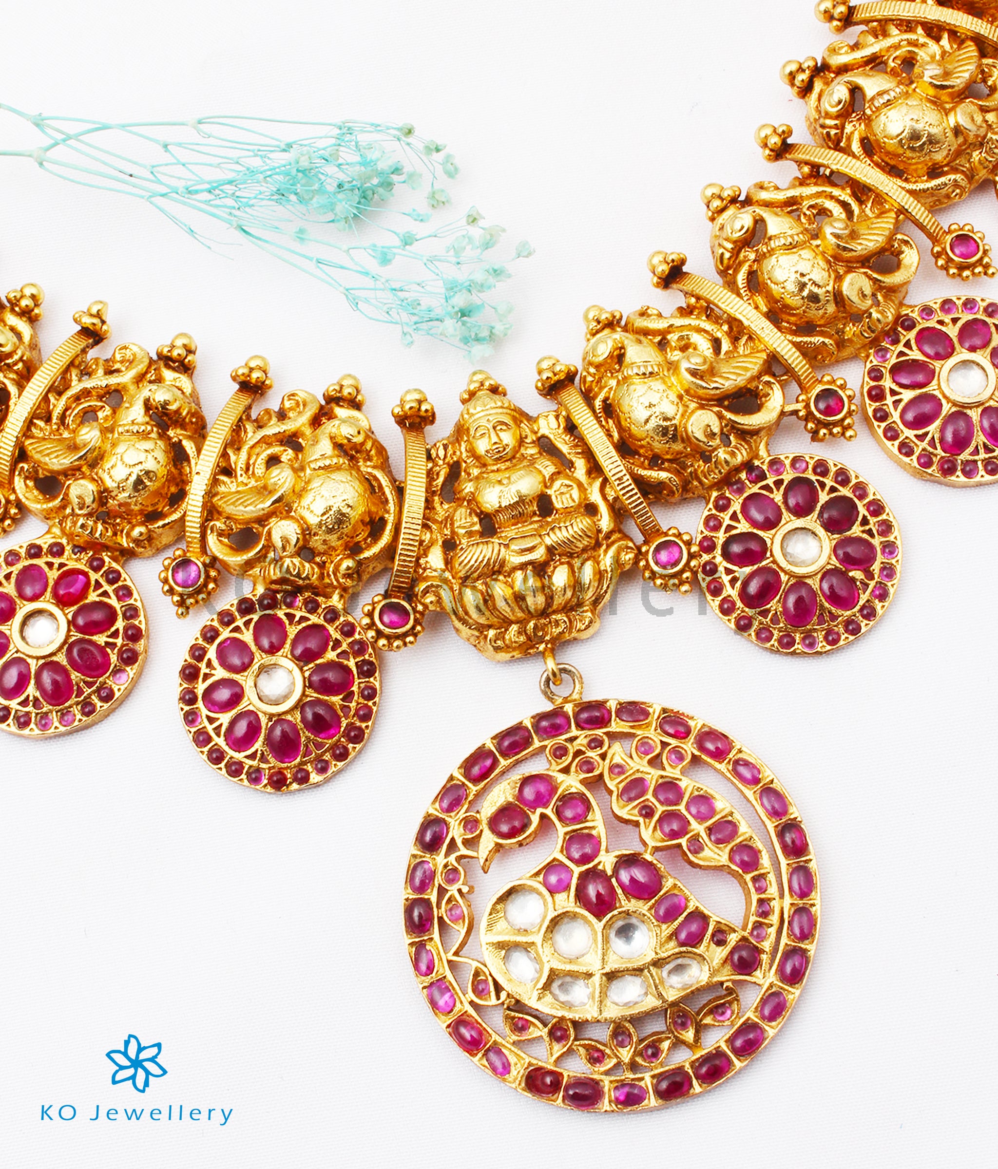 Handcrafted using techniques used in ancient South Indian antique jewellery and studded with tiny kempu stones it is gold-dipped in a special process to give an antique look.