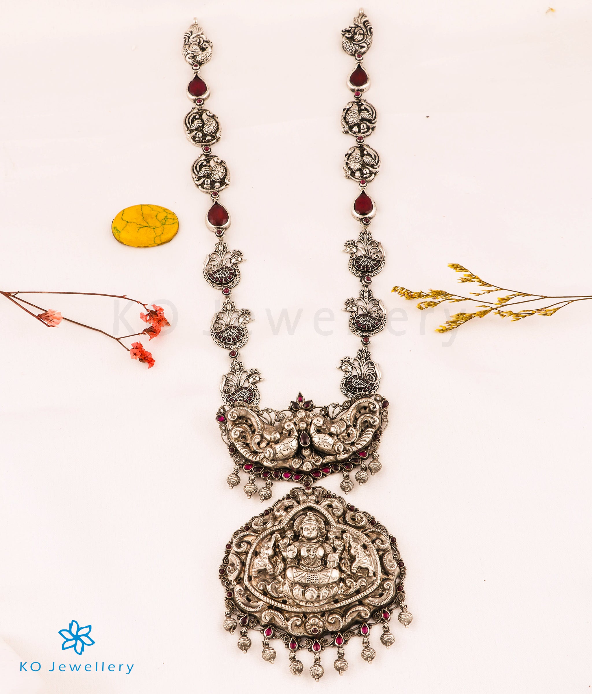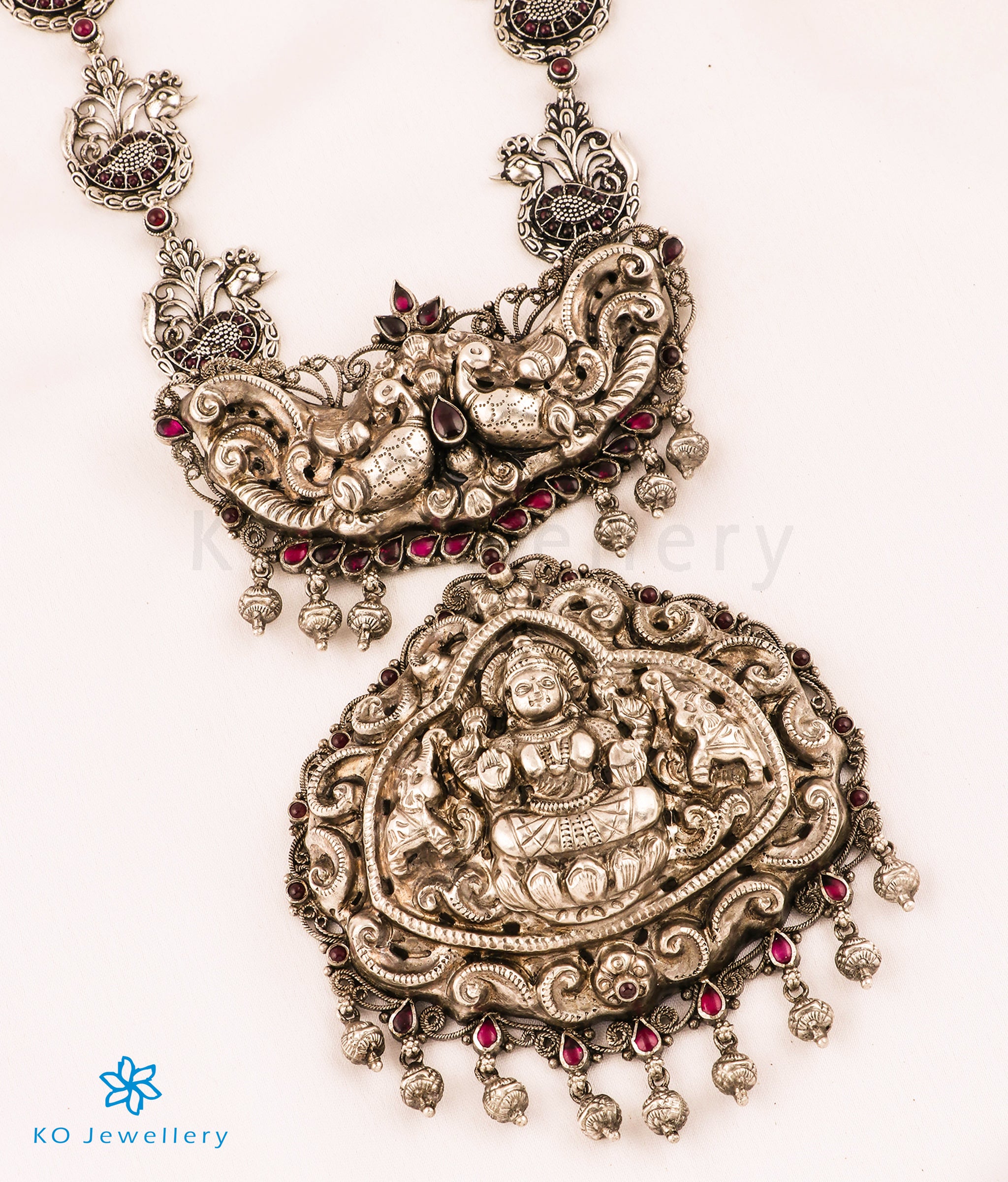 The pendant is hung on a peacock motif chain accented by kemp stones , that is simply gorgeous. Crafted using techniques used in ancient South Indian antique gold temple jewellery the entire piece is crafted in pure Sterling silver(92.5%) and oxidised.