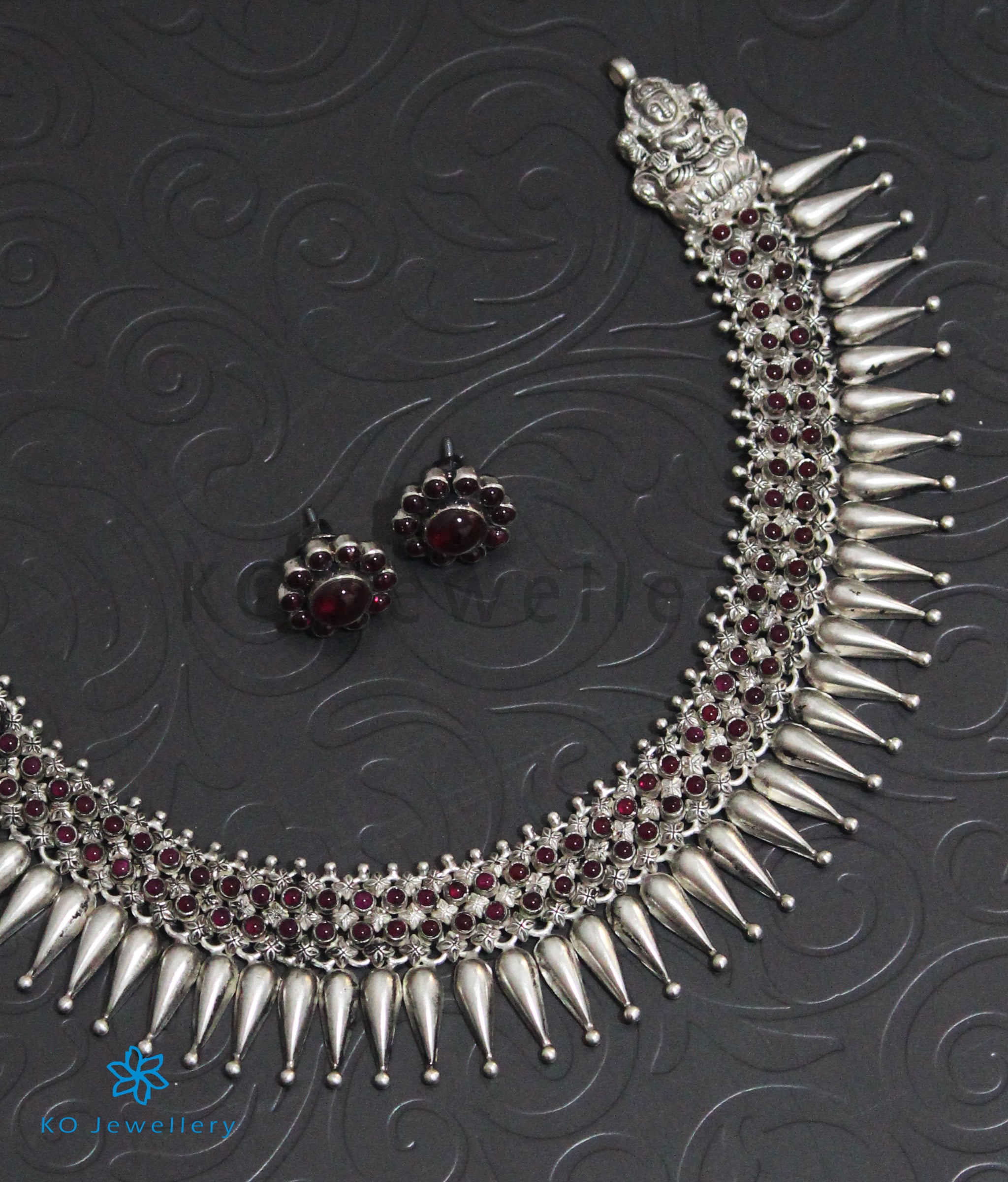 Wear a design that has been part of Indian jewellery design since antiquity.Inspired by the `jasmine bud' this Sterling Silver (92.5%) necklace is indeed a classic piece of jewellery.Two regal Lakshmi pendants hold up the necklace on either side.This necklace is paired with matching earstuds.