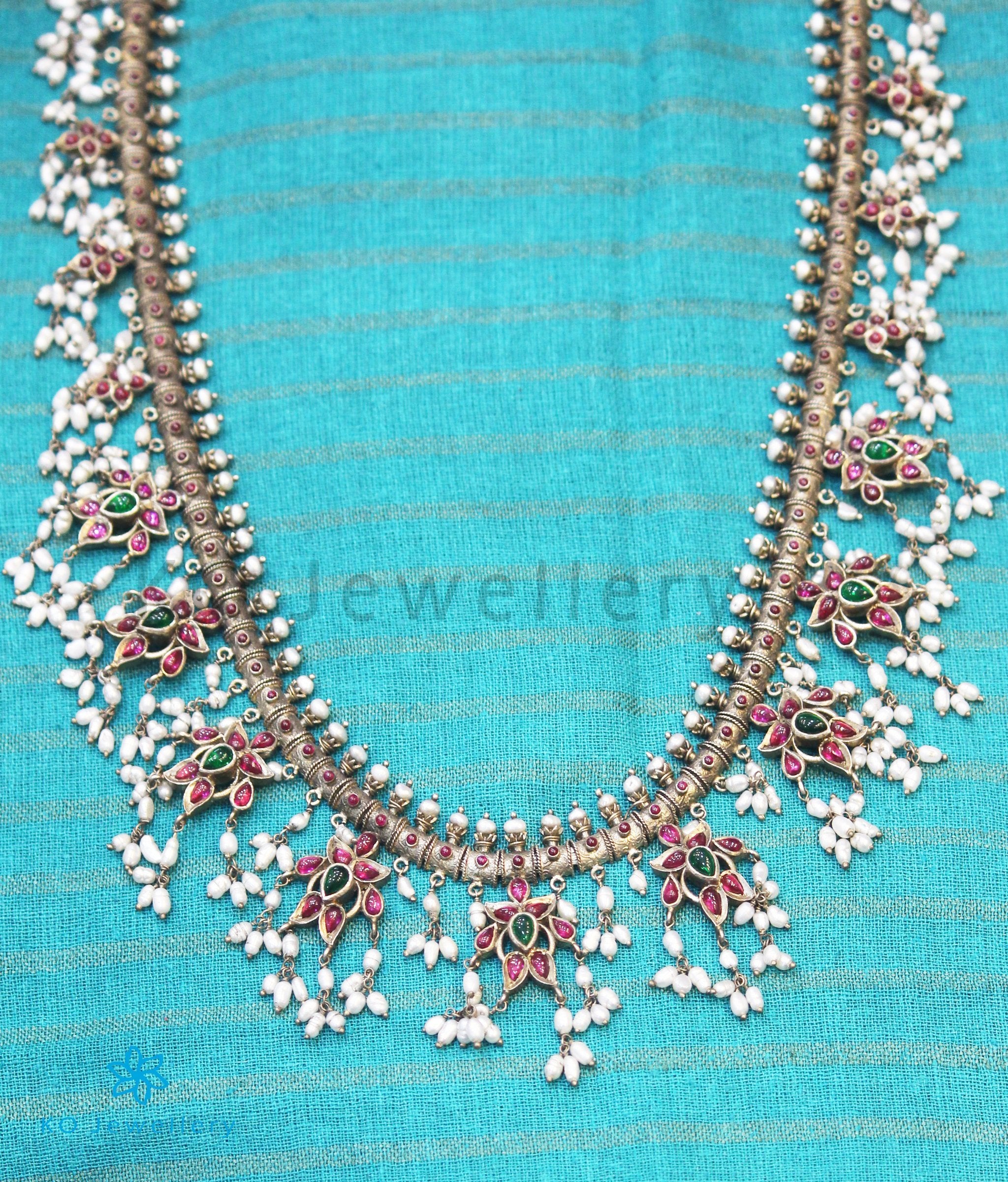 A floral design Guttapusalu necklace with pretty pendants all over this is a gorgeous piece of heritage jewellery .The Gutta Pusalu is a classic design from Andhra Pradesh and is named so because the necklace is fringed with bunches of small pearls very similar to "a shoal of small fish" (gutta) .Pusalu means "beads" and this design originated in areas close to the ancient pearl fisheries along the Coromandel coast of India.