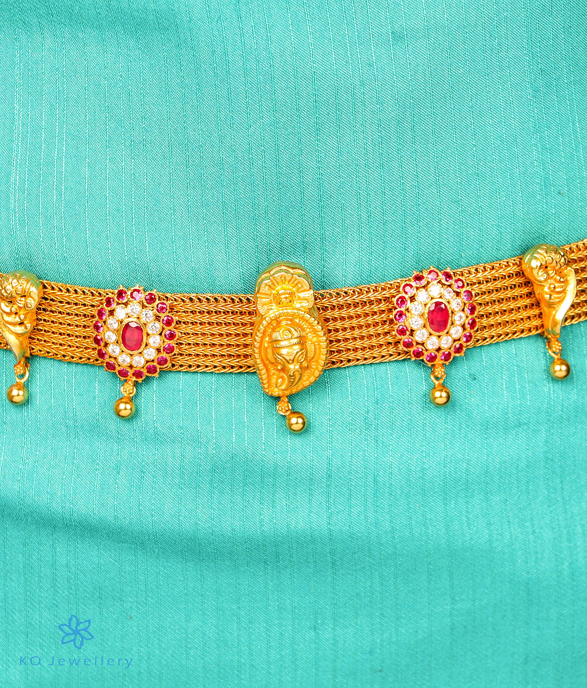 A gorgeous and ornate piece, this bridal waist belt handcrafted in a traditional design in Sterling Silver (92.5%) with a central Ganesha pendant flanked by two kemp stone pendants and peacocks, is the right piece of jewellery for someone who loves handcrafted elegance.