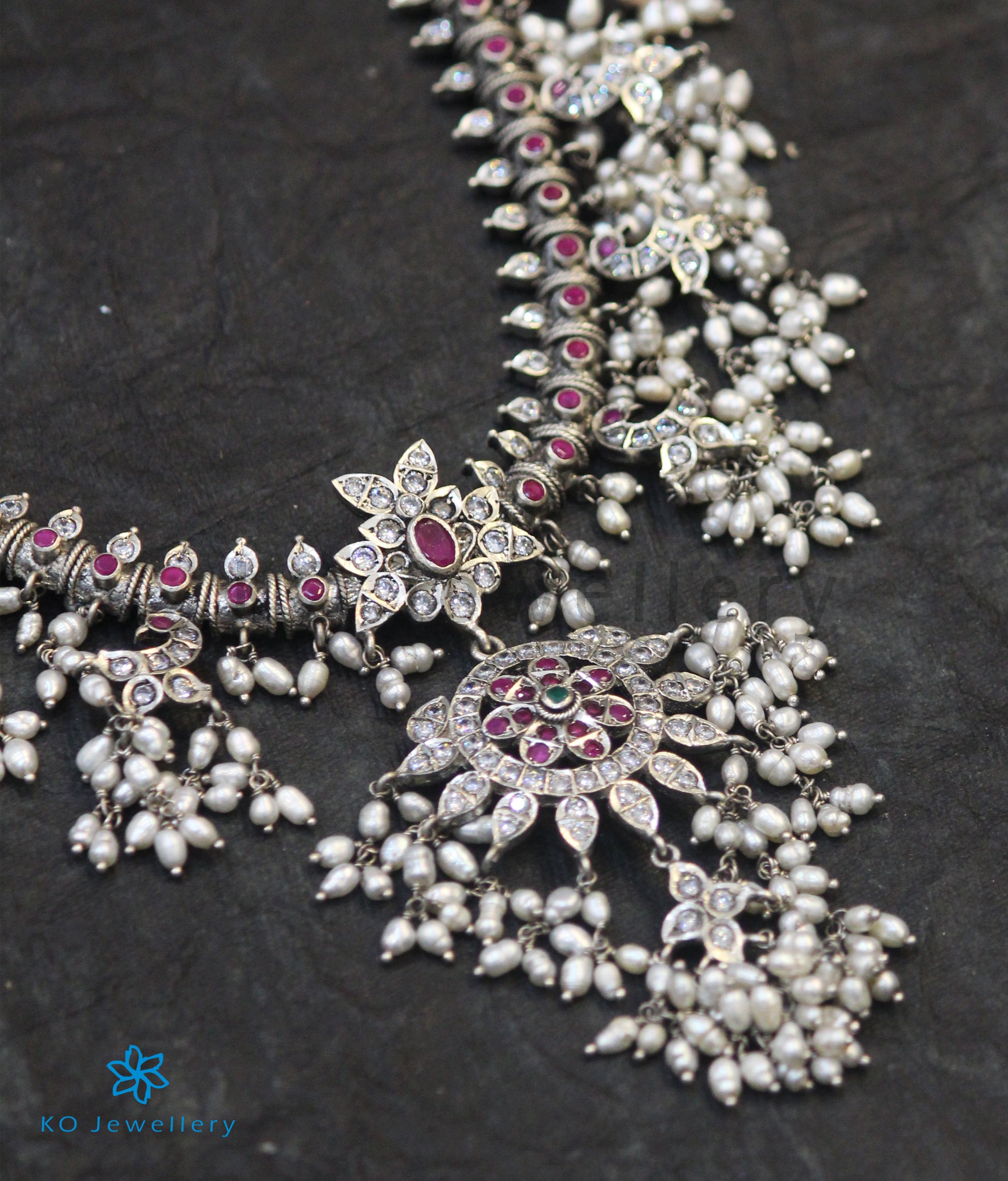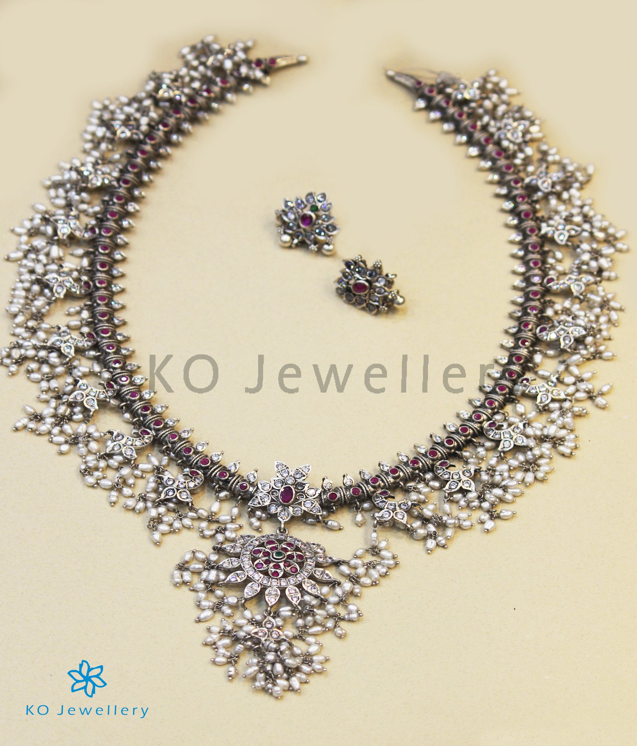 This guttapusalu necklace is a faithful reproduction of the traditional design of the necklace.Handcrafted in Sterling Silver (92.5%) with techniques, used to craft temple jewellery for centuries this necklace is a heirloom piece. This necklace is available in gold-finish on request.