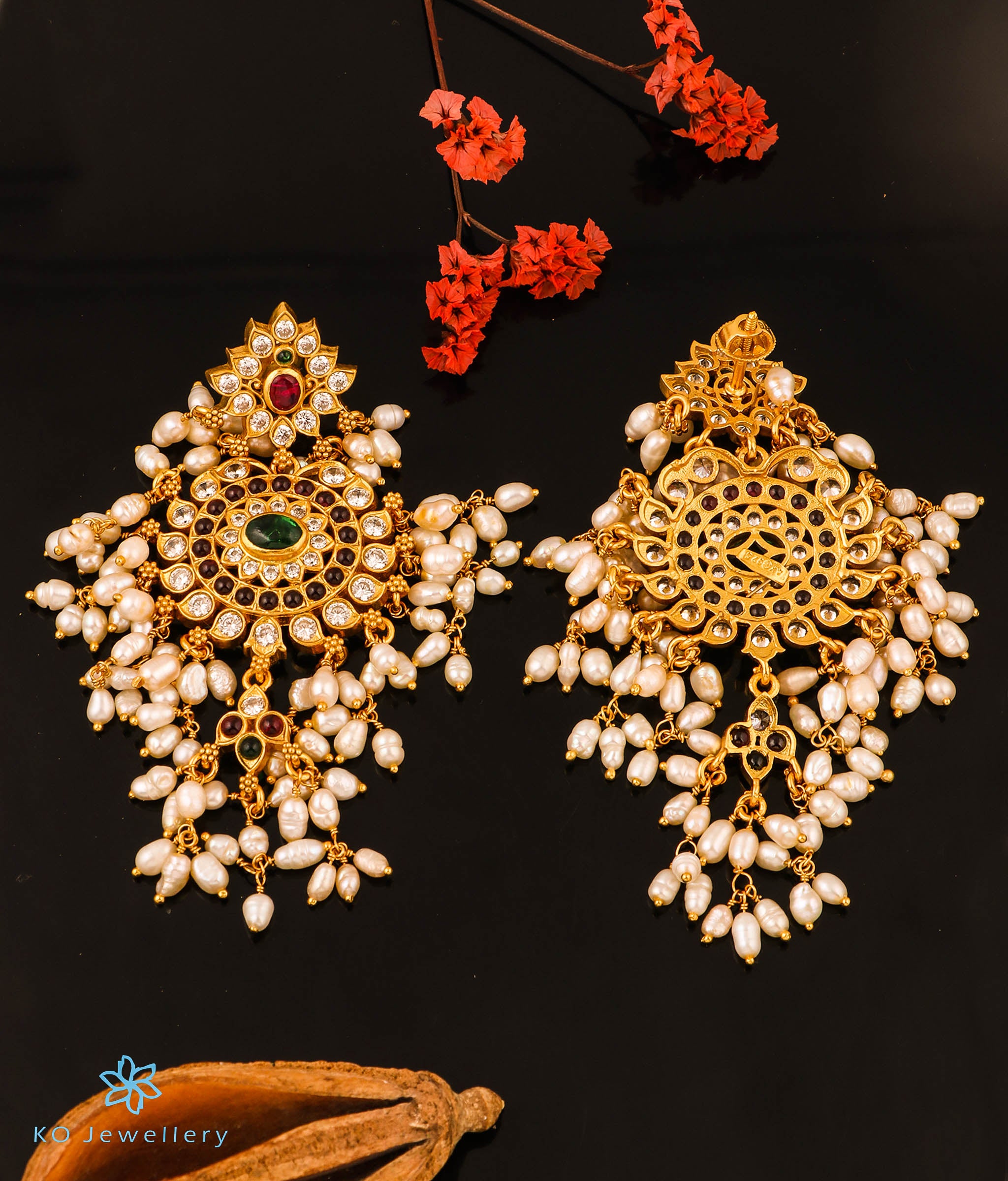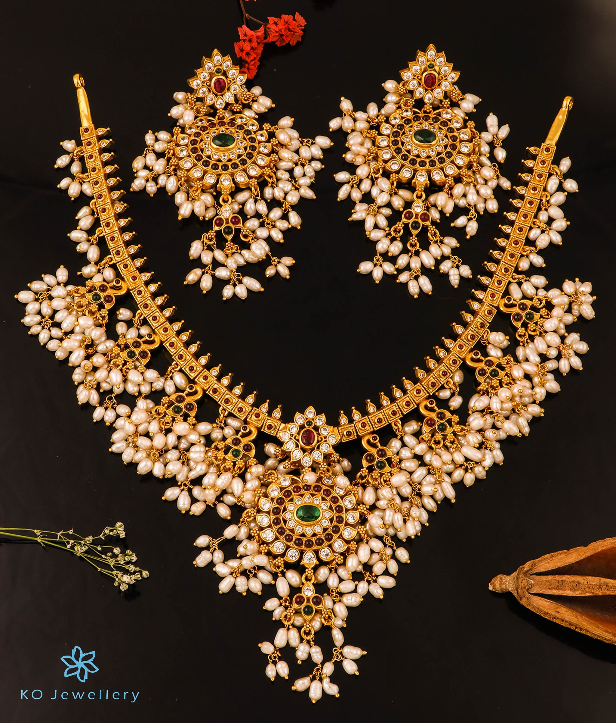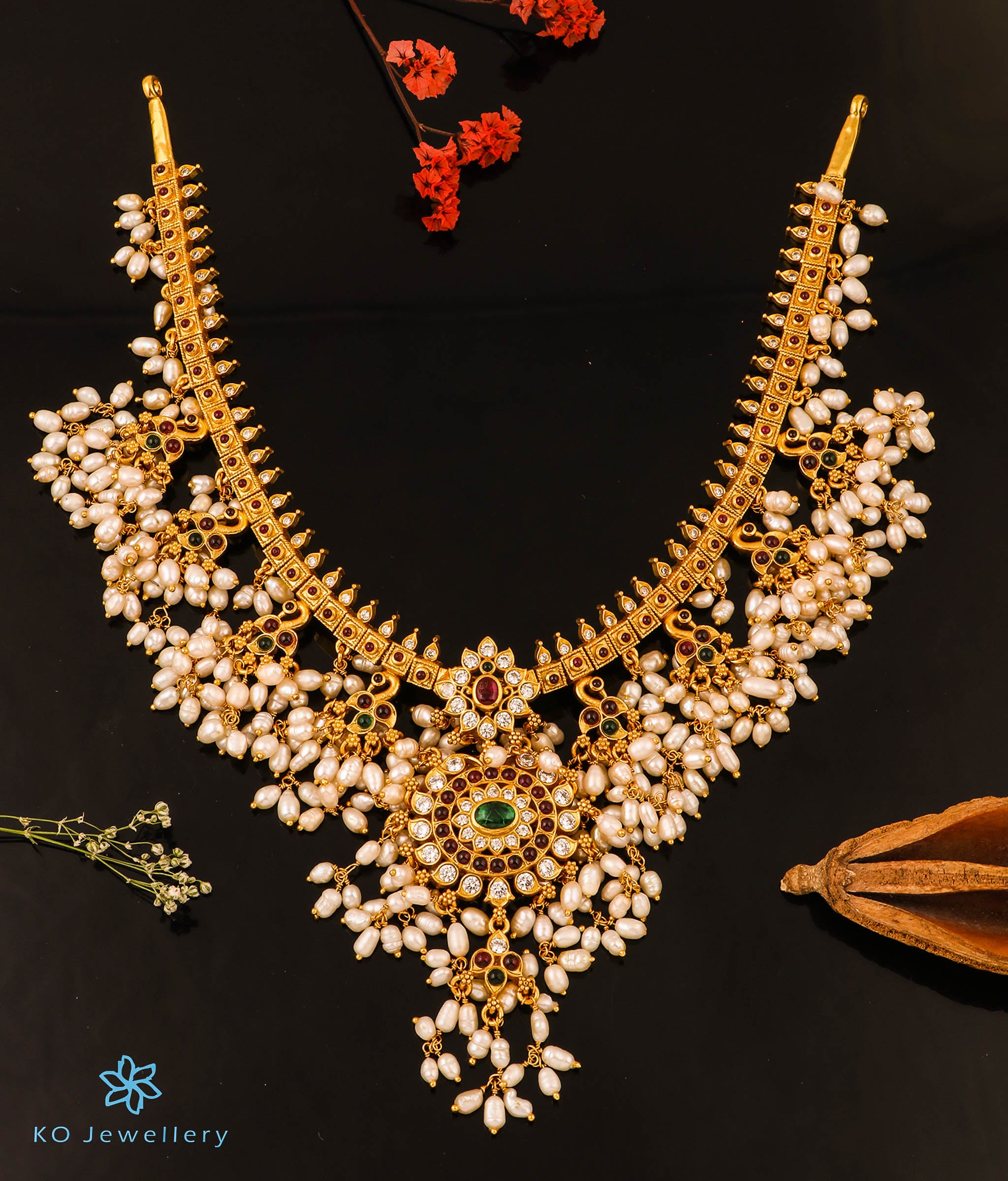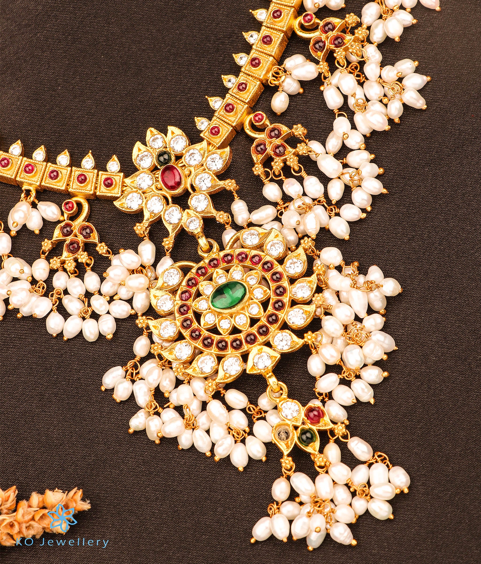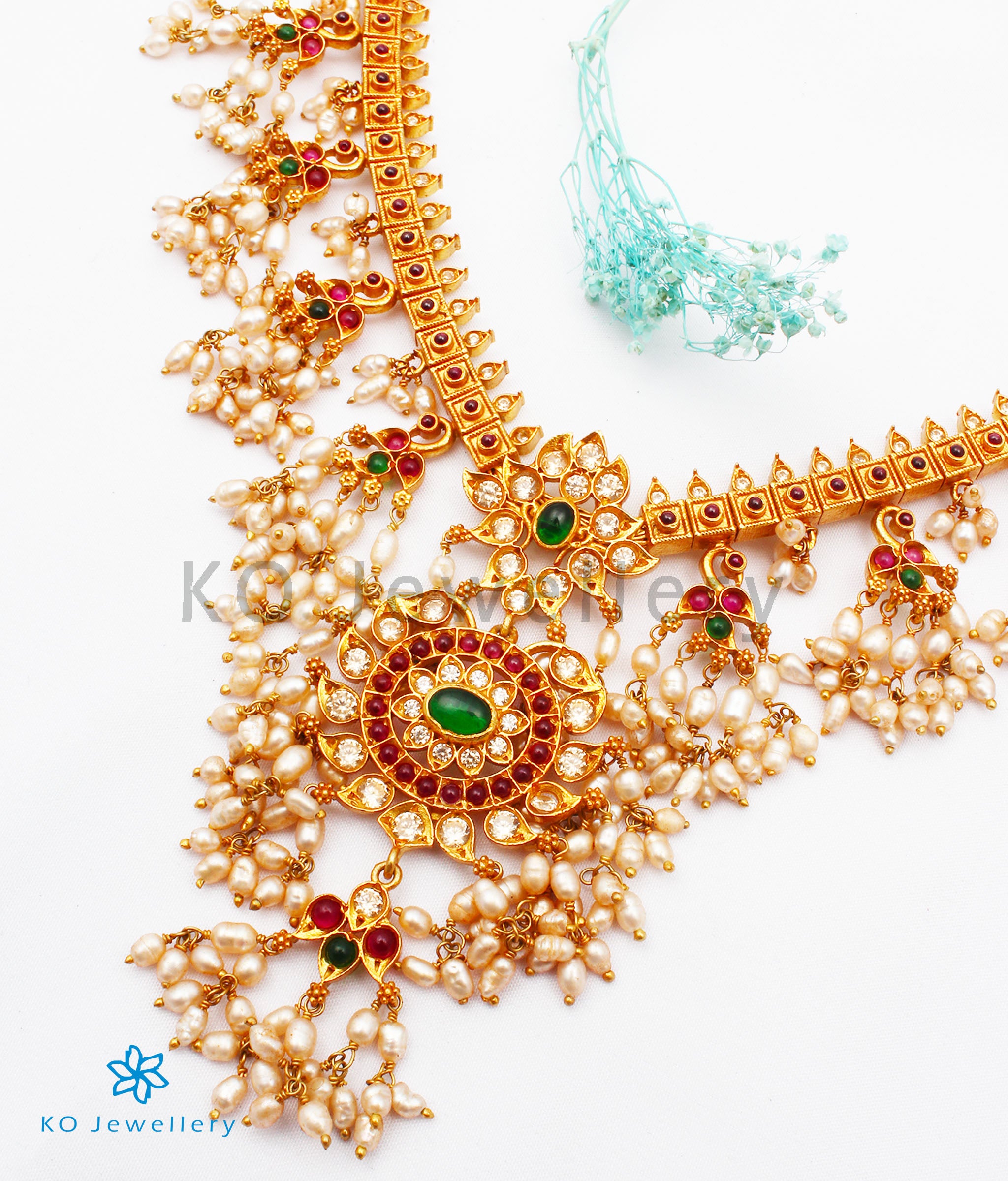 If you want to stun everyone with a bespoke piece of jewellery this is the design for you. This heritage necklace carries the peacock motif in its various pendants and is decorated with natural Pearl. The Gutta Pusalu is a classic design from Andhra Pradesh and is named so because the necklace is fringed with bunches of small pearls very similar to "a shoal of small fish" (gutta) .Pusalu means "beads" and this design originated in areas close to the ancient pearl fisheries along the Coromandel coast of India.