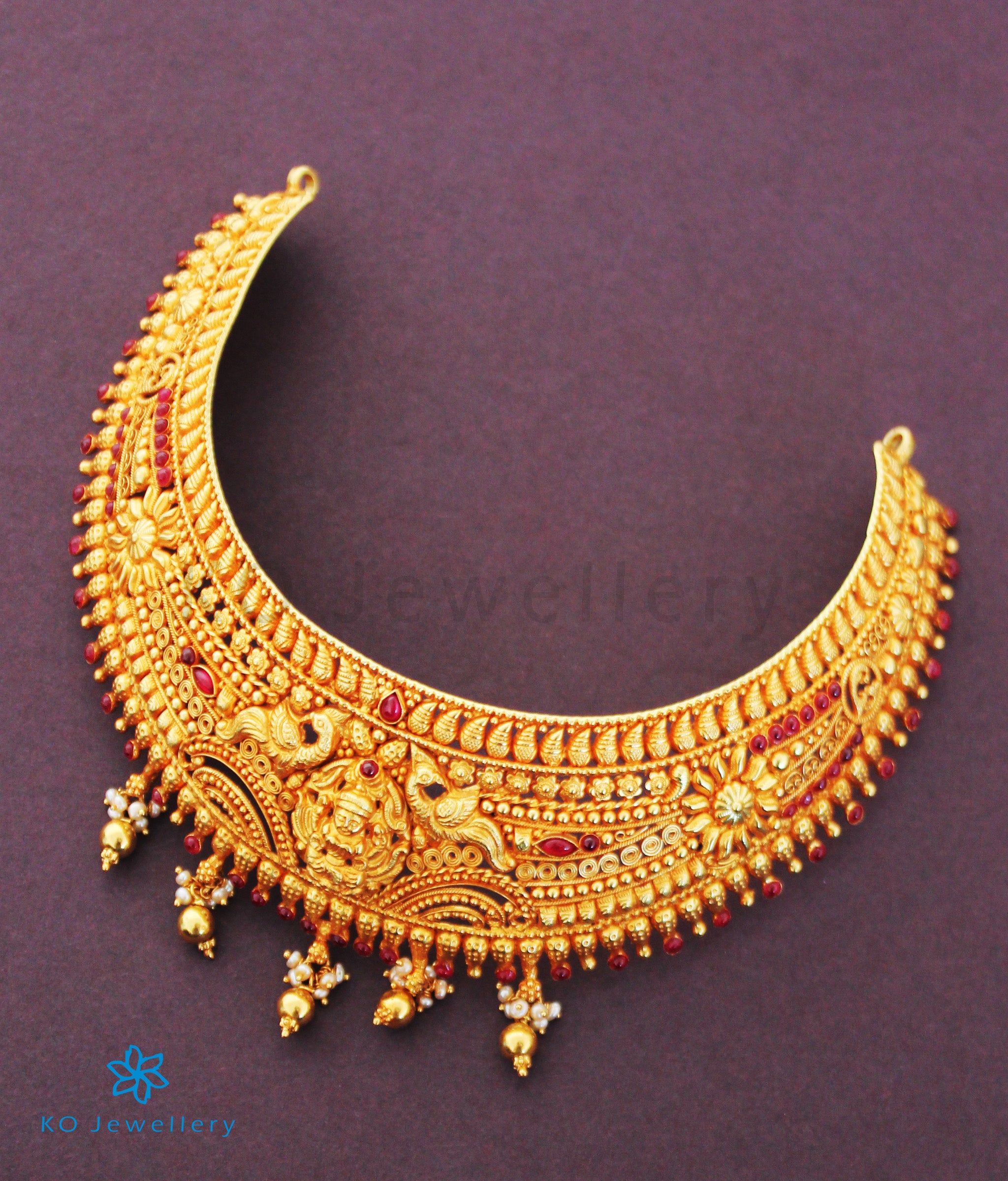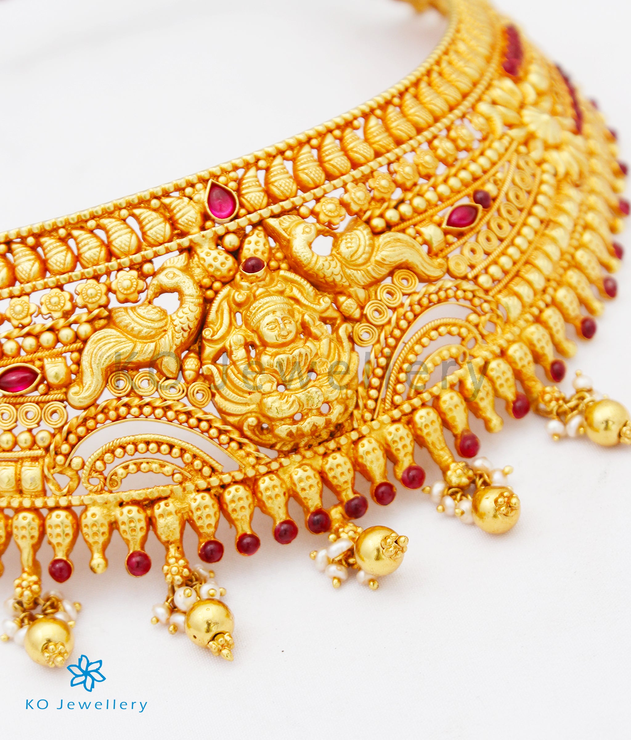 An ornate choker necklace with the image of Lakshmi in the center surrounded by intricate detailing and twin peacocks.The entire piece is crafted in pure Sterling Silver (92.5%) and gold-dipped.