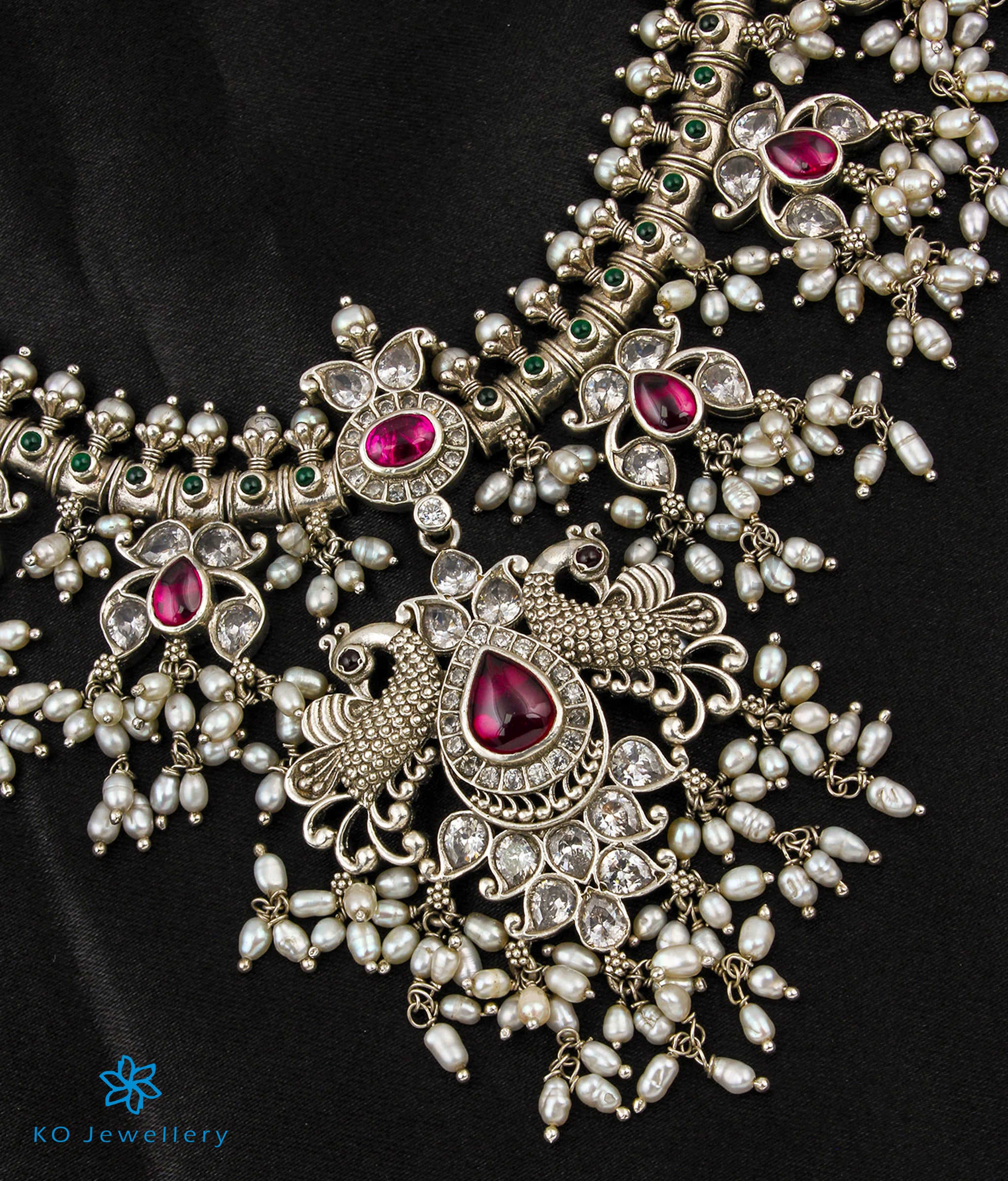 Handcrafted in Sterling Silver (92.5%) with techniques, used to craft temple jewellery for centuries this necklace is a heirloom piece. This necklace is available in gold-finish on request.