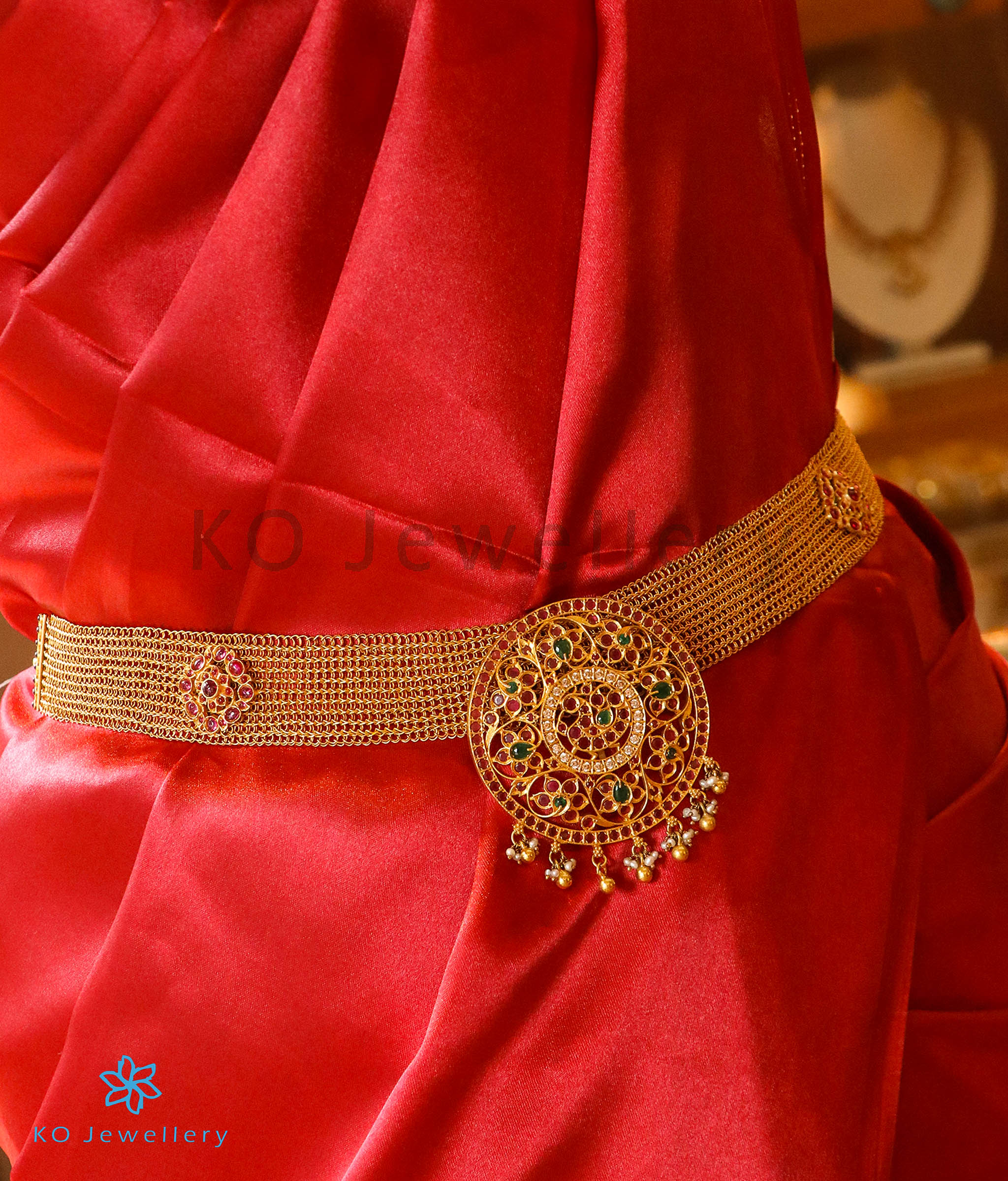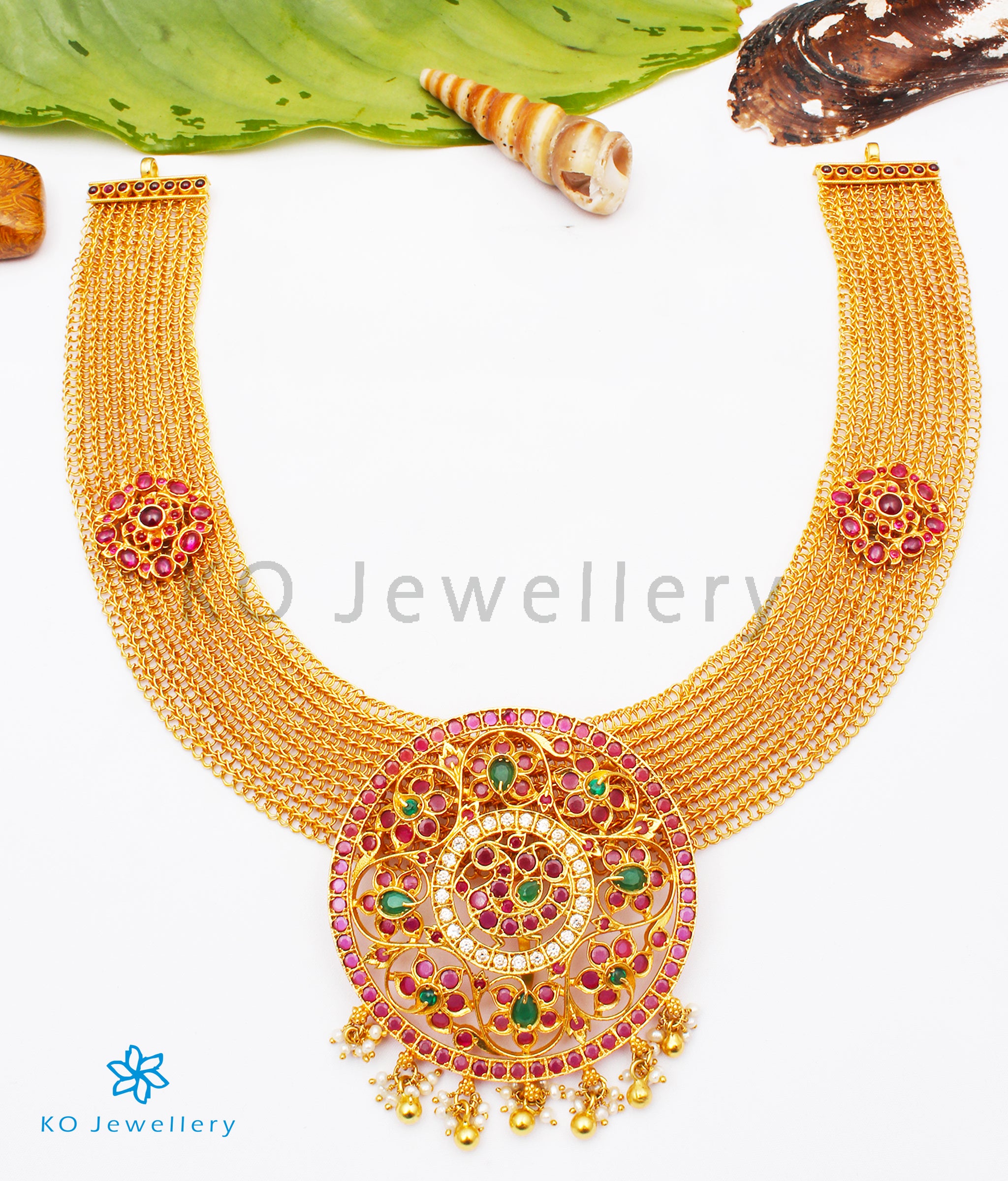Jewellery that multitasks makes for a great accessory as you can wear it in more than one way. This is an ornate haaram with a 'rakodi' peacock motif pendant in the center that can be worn as both a necklace as well as waist belt . What's more the pendant is removable and can be used as a pendant alone.