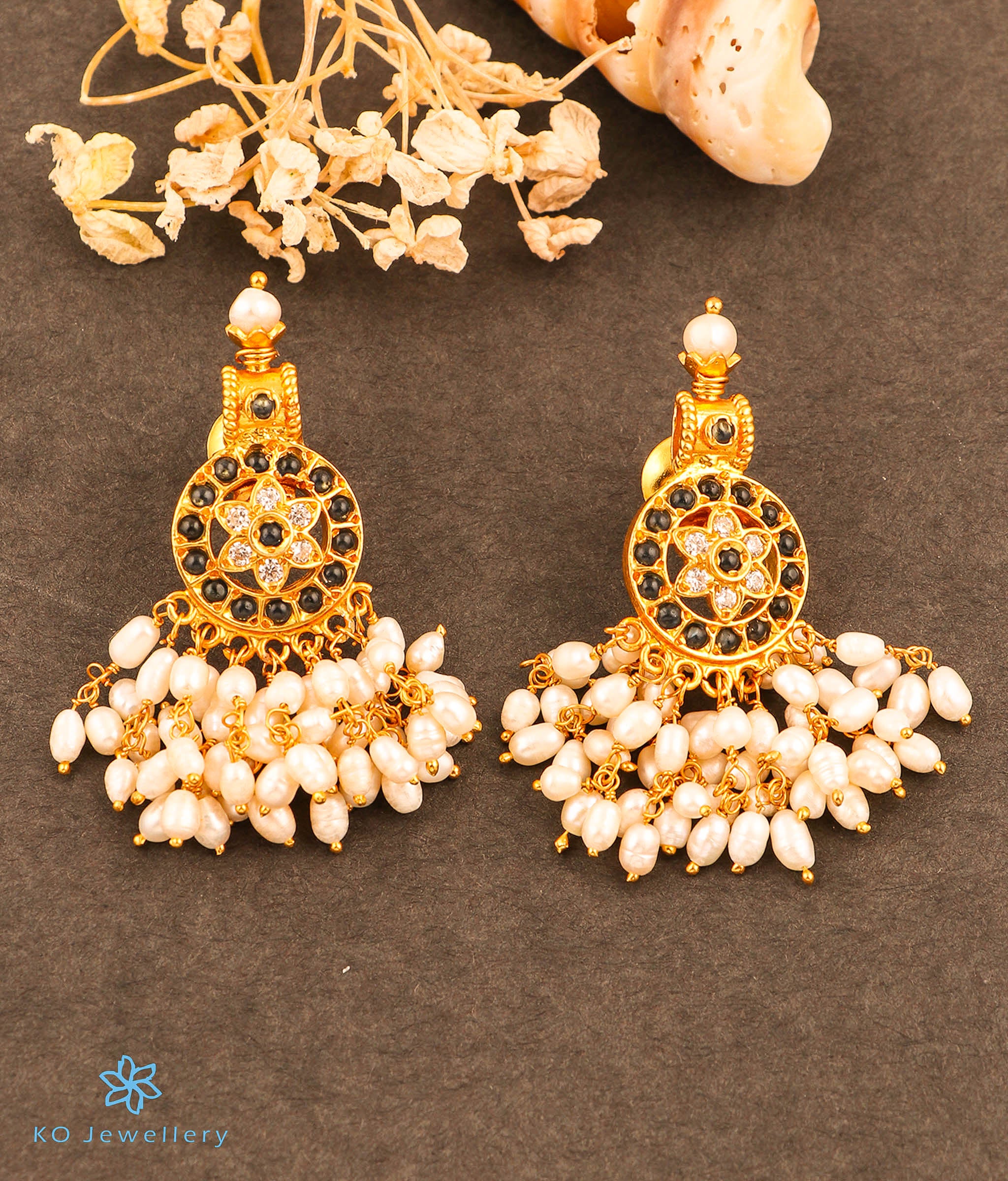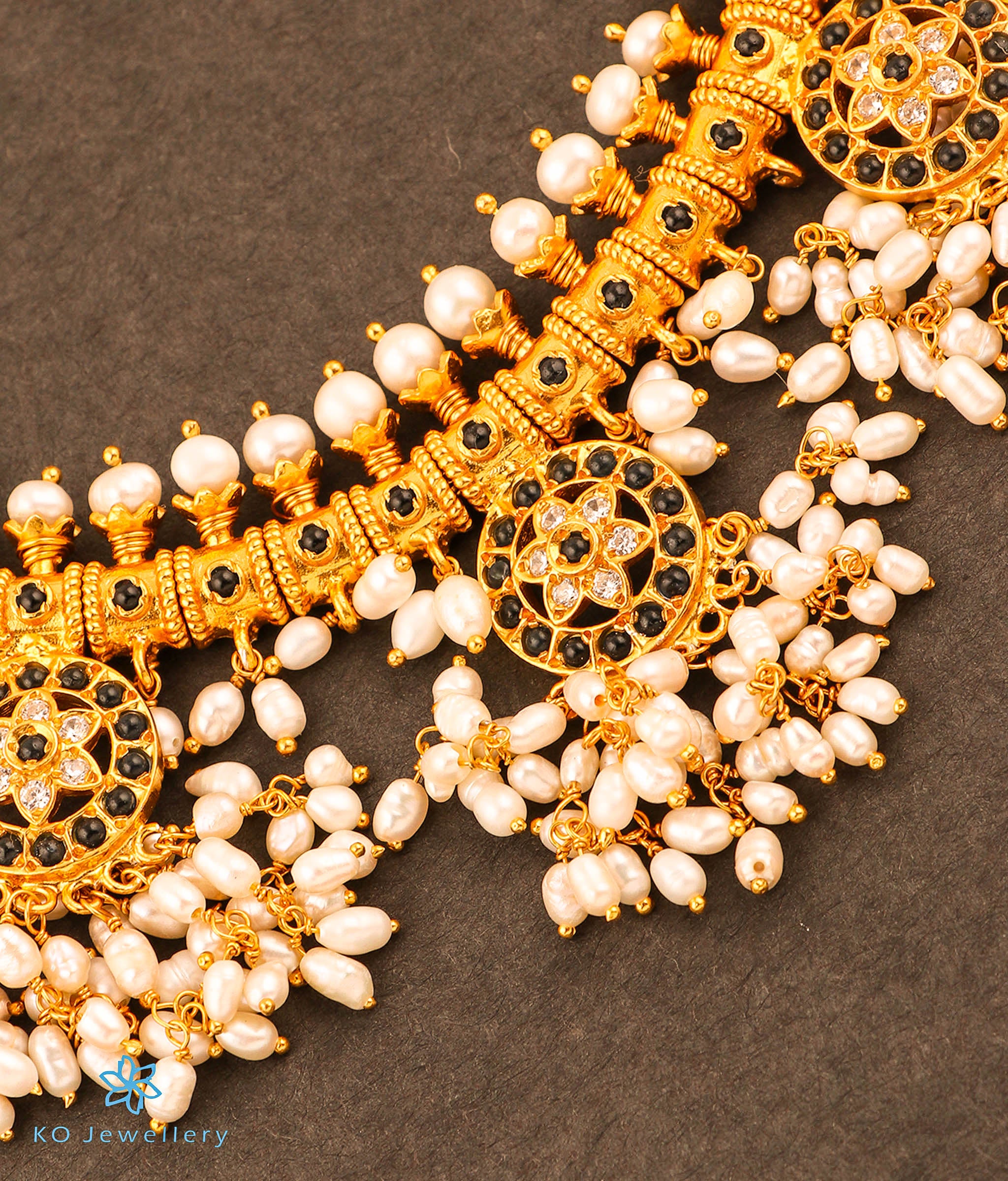 Feel like royalty when you dress up in this gorgeous piece of heritage jewellery .The Gutta Pusalu is a classic design from Andhra Pradesh and is named so because the necklace is fringed with bunches of small pearls very similar to "a shoal of small fish" (gutta) .Pusalu means "beads" and this design originated in areas close to the ancient pearl fisheries along the Coromandel coast of India.