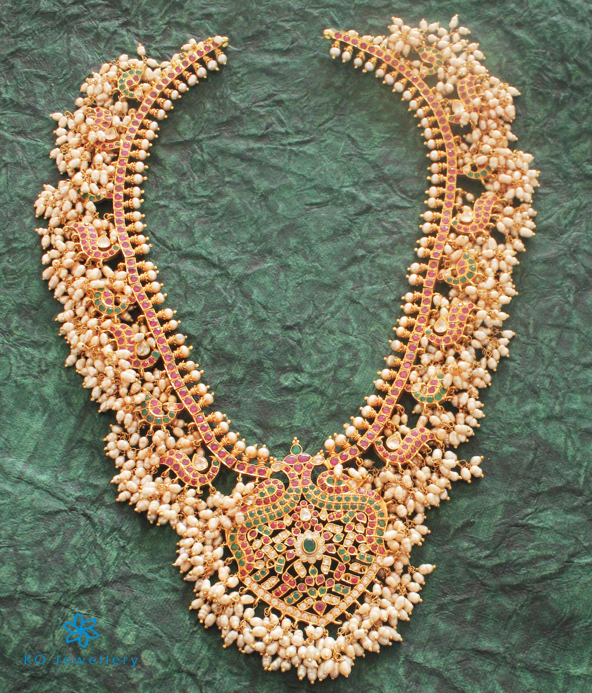 If you want to stun everyone with a bespoke piece of jewellery this is the design for you. This heritage necklace carries twin peacocks in its pendant as well as the necklace string.The Gutta Pusalu is a classic design from Andhra Pradesh and is named so because the necklace is fringed with bunches of small pearls very similar to "a shoal of small fish" (gutta) .Pusalu means "beads" and this design originated in areas close to the ancient pearl fisheries along the Coromandel coast of India.