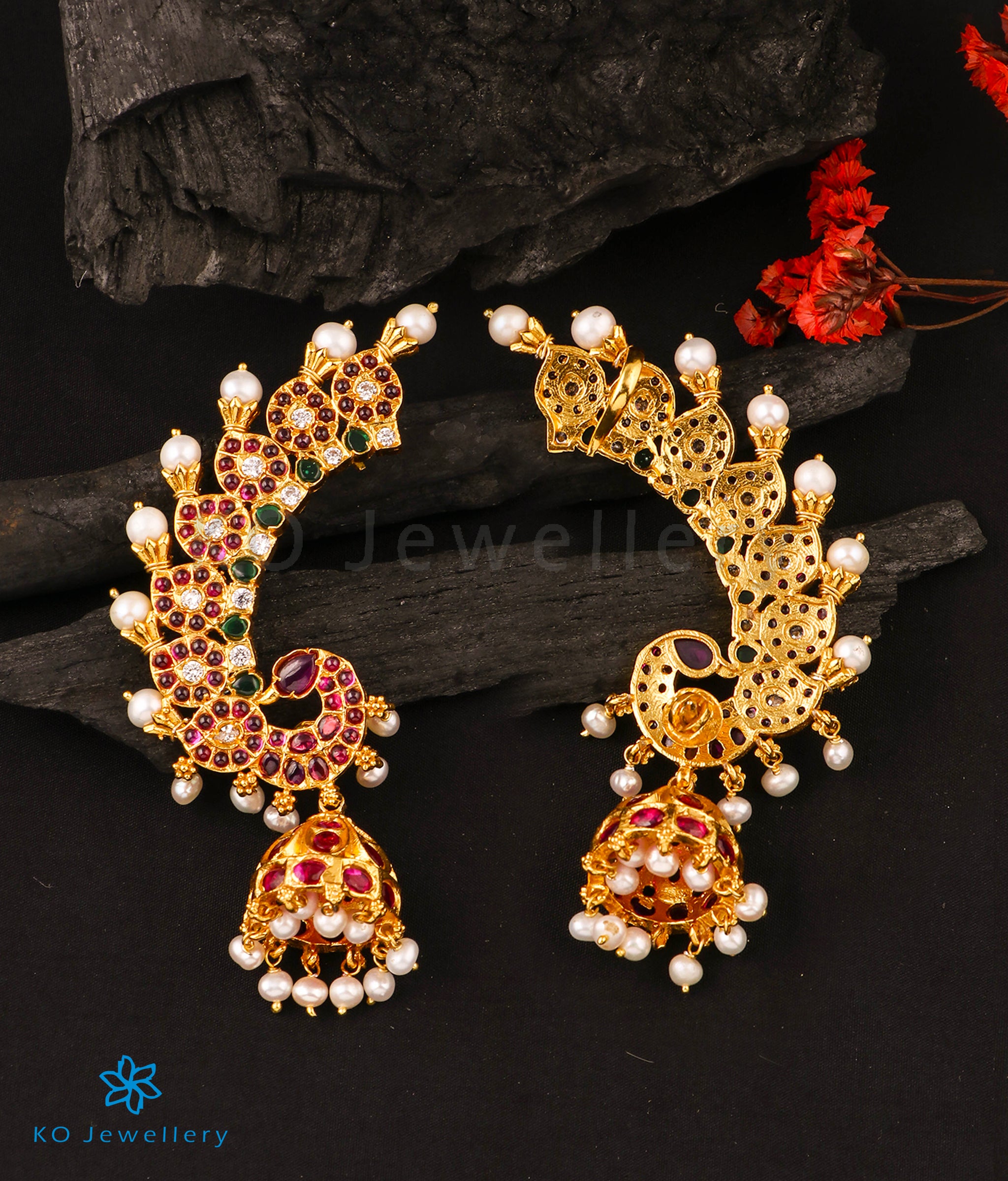 Striking and beautiful this pair of Sterling Silver (92.5%) peacock-motif Ear-cuffs with jhumka is definitely a head-turner. The peacock is studded with kempu stone and natural Pearl. Pure, unique, handmade and gorgeous.