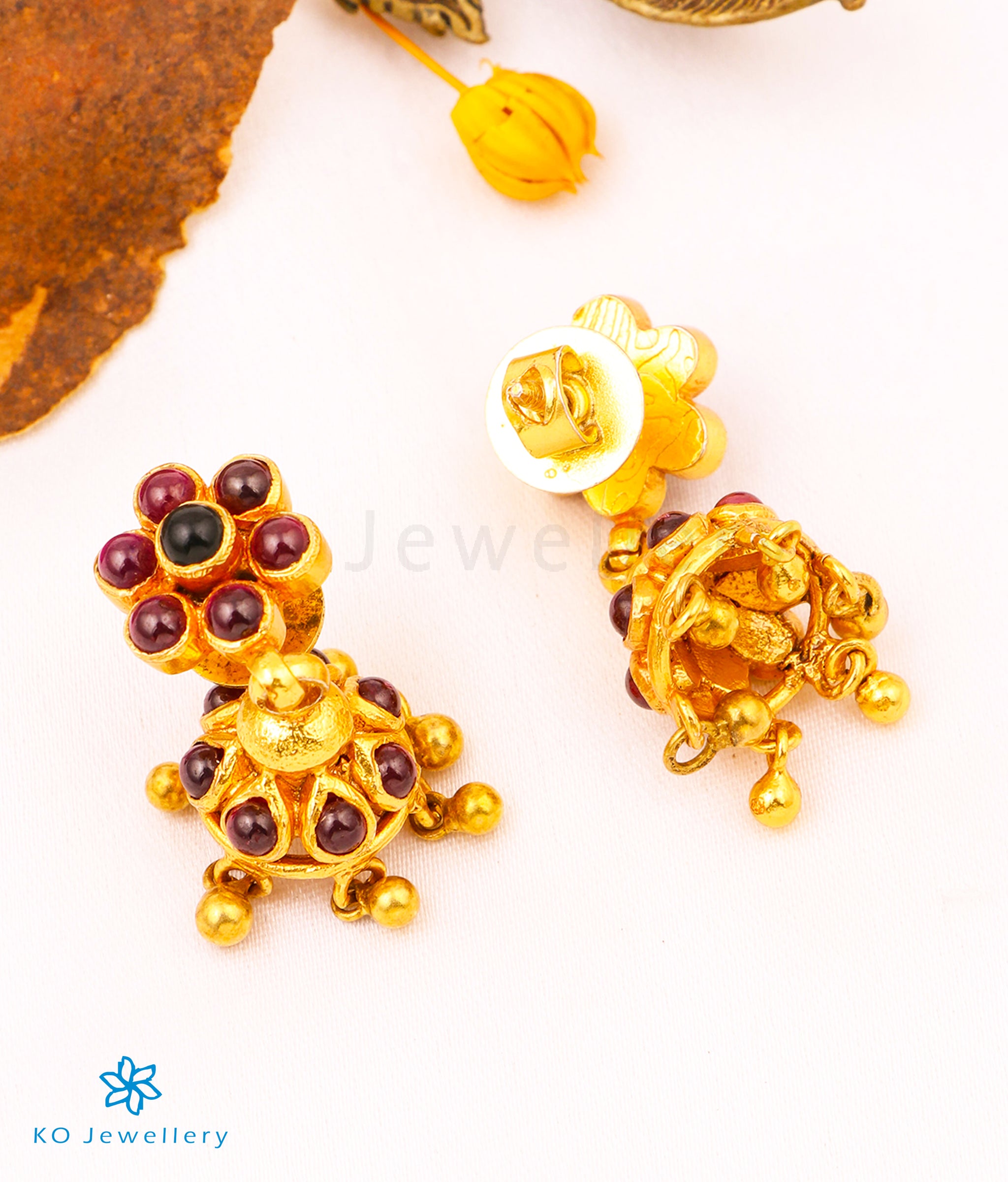 A beautiful kempu stone jhumka , the antique gold-dipped finish gives it an irresistable charm. Crafted using technqk jhuues used in ancient South Indian antique gold temple jewellery the entire piece is crafted in Sterling Silver (92.5%) silver .