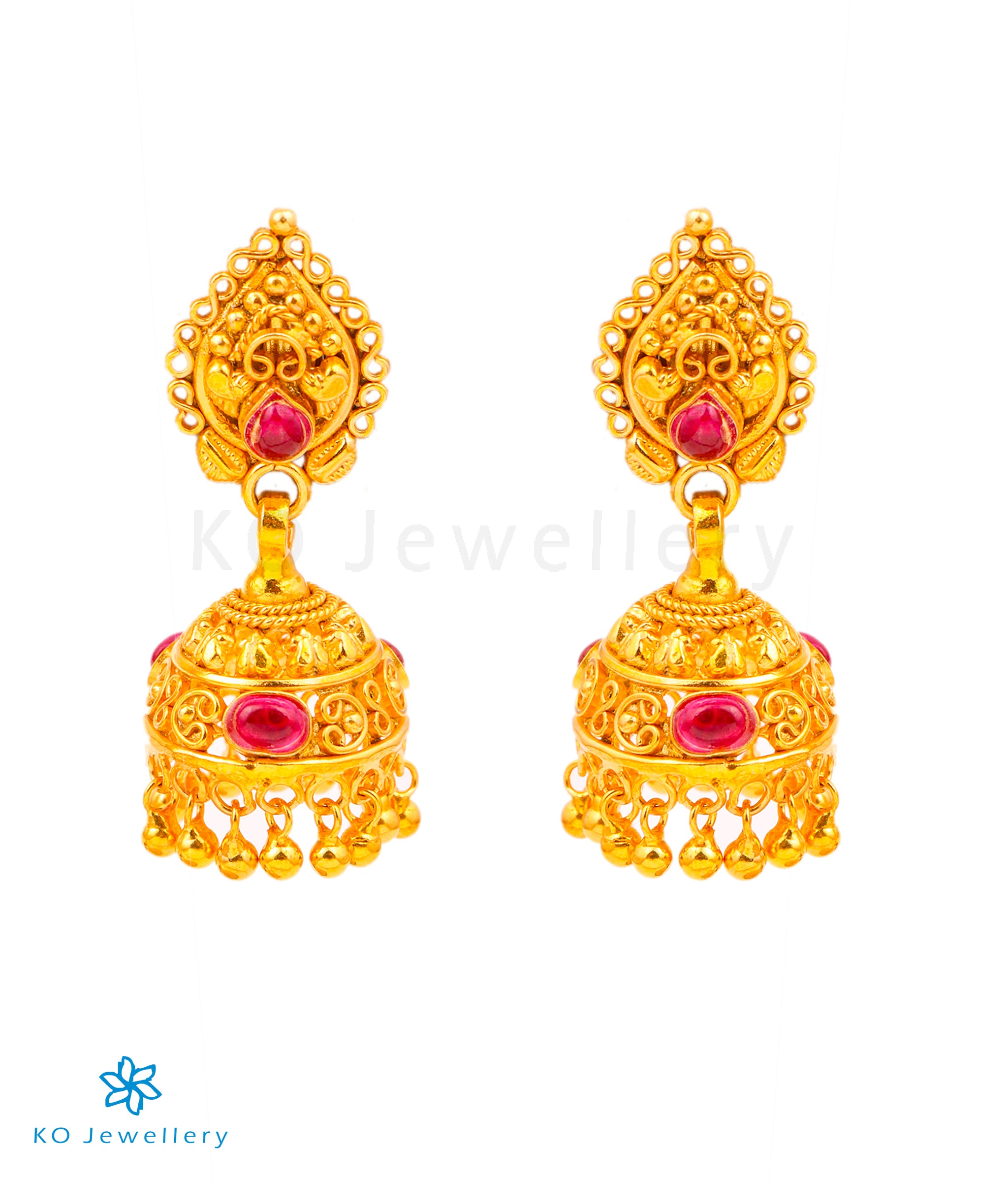 A beautiful kempu stone jhumka , the antique gold-dipped finish gives it an irresistable charm. Crafted using technqk jhuues used in ancient South Indian antique gold temple jewellery the entire piece is crafted in Sterling Silver (92.5%) silver .