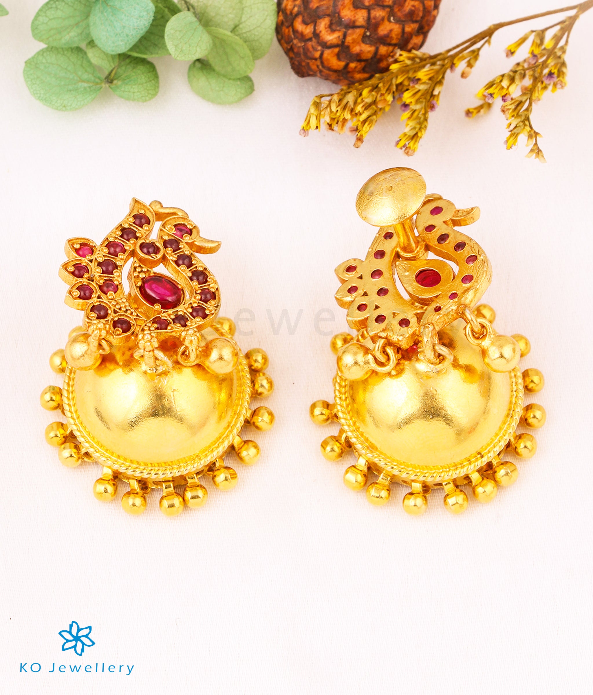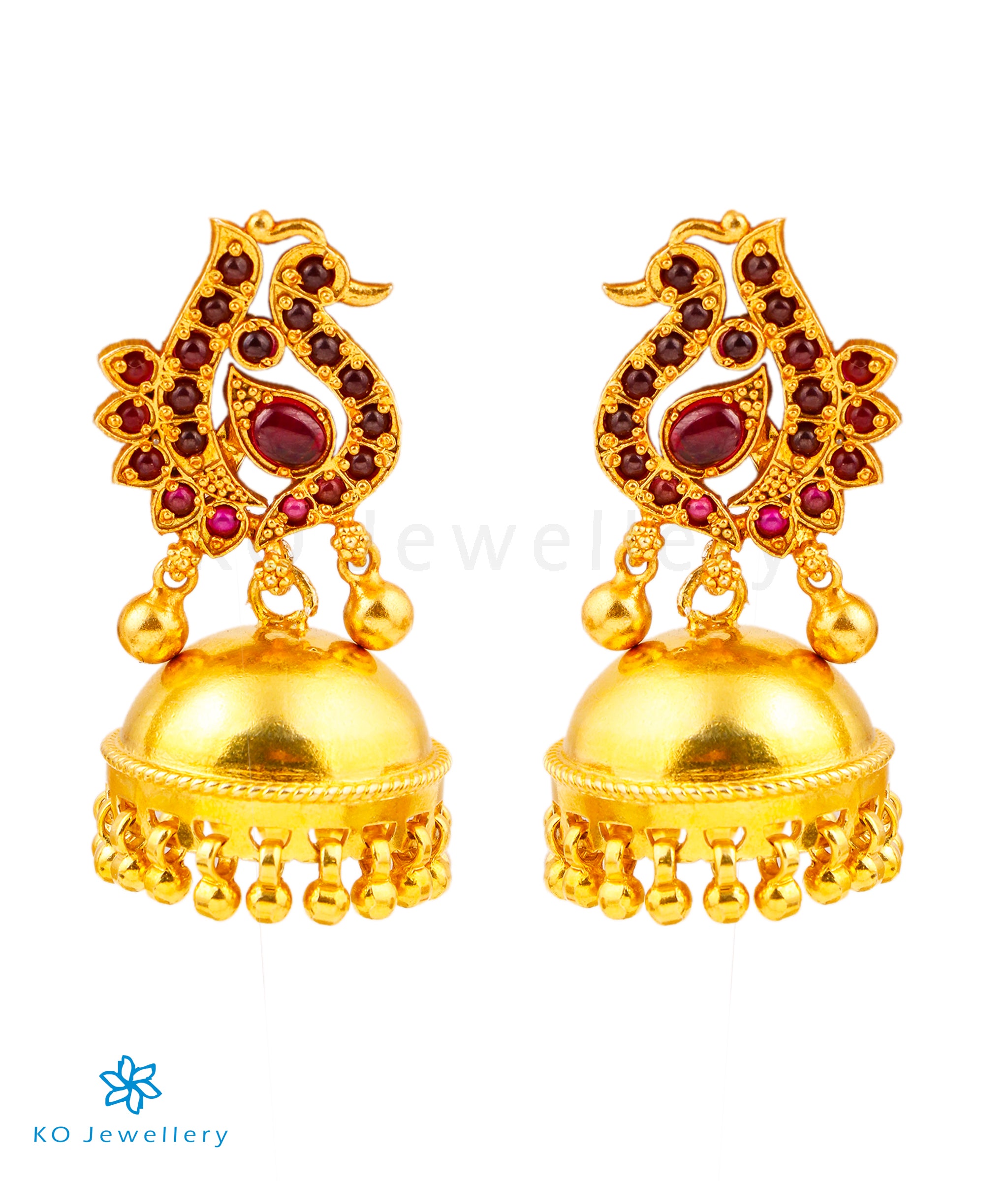 Extremely attractive and skillfully handcrafted this peacock motif jhumka set with red `kempu' stones is simply stunning . Handcrafted with unmatched skill and perfection using techniques used in ancient South Indian antique gold temple jewellery the entire piece is crafted in pure Sterling Silver (92.5%) and gold-dipped to perfection.