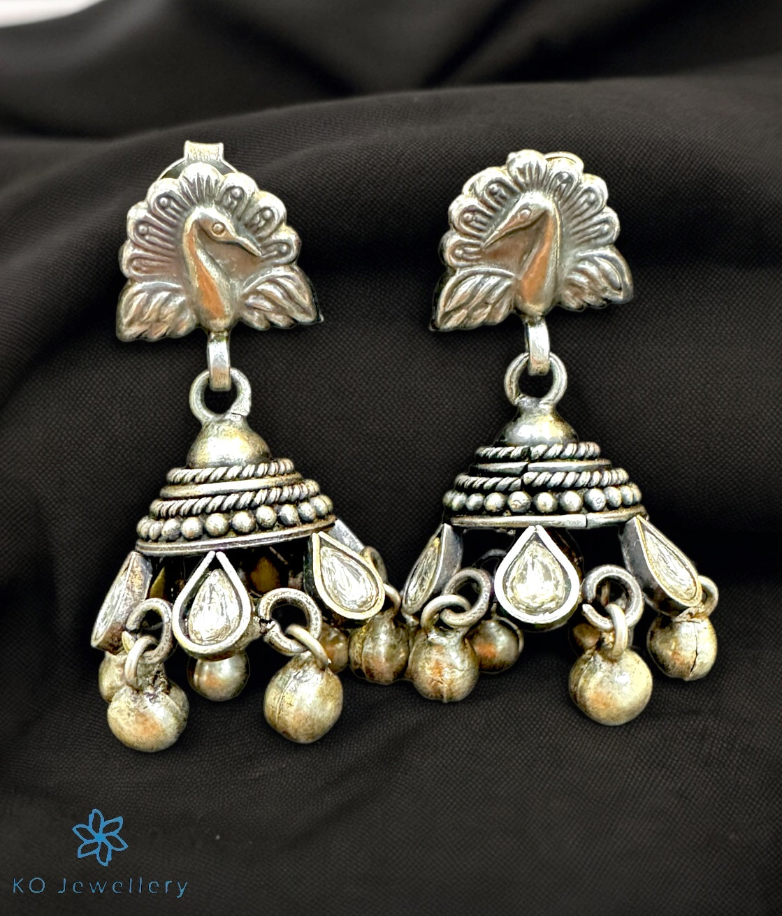 The Warhi Silver Antique Peacock Jhumkas