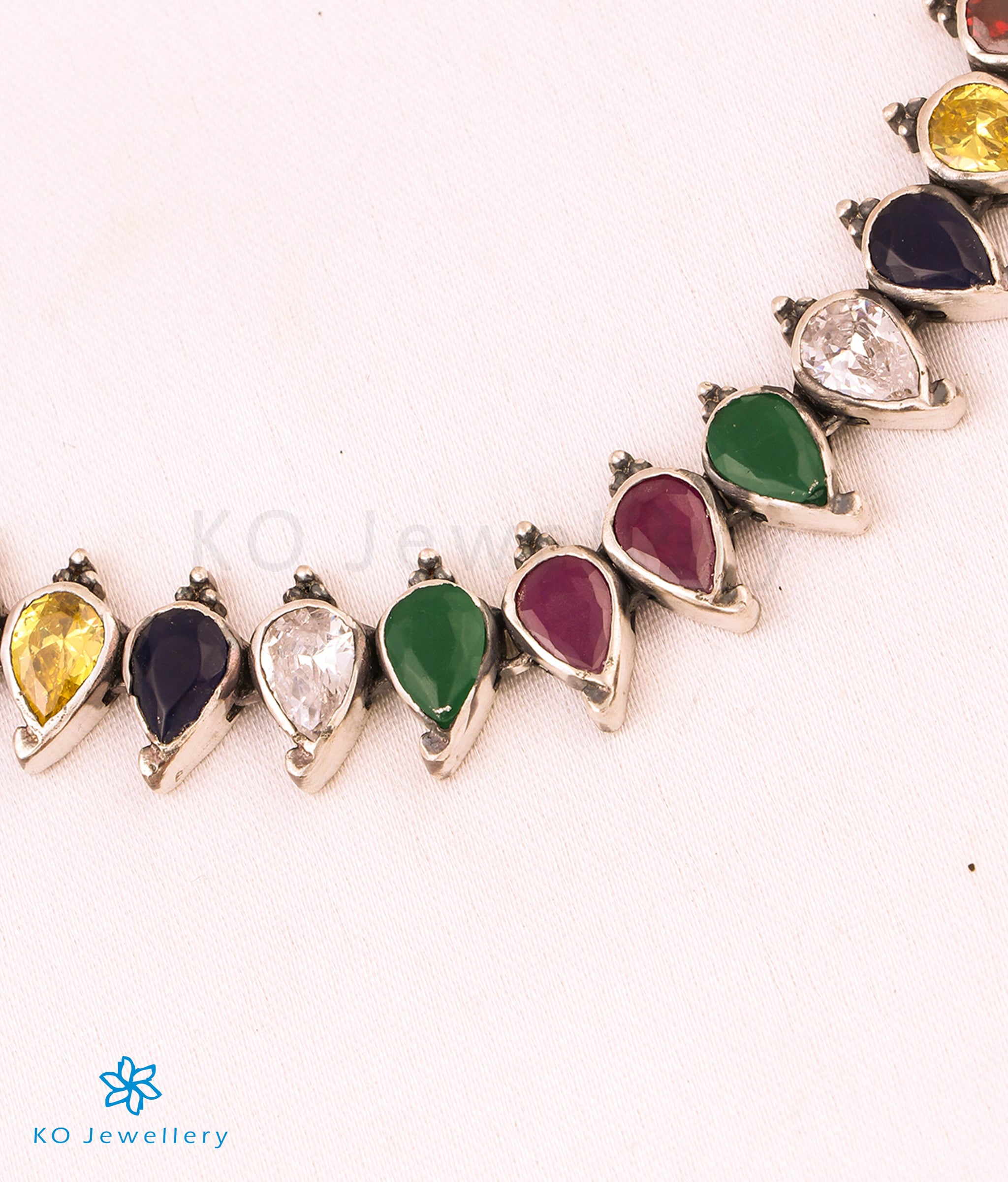 Catch everyone's attention with this beautiful Sterling Silver (92.5%) navratna or nine-gems necklace which will match any oufit. Crafted using techniques used in ancient South Indian antique gold temple jewellery the entire piece is crafted in pure silver.