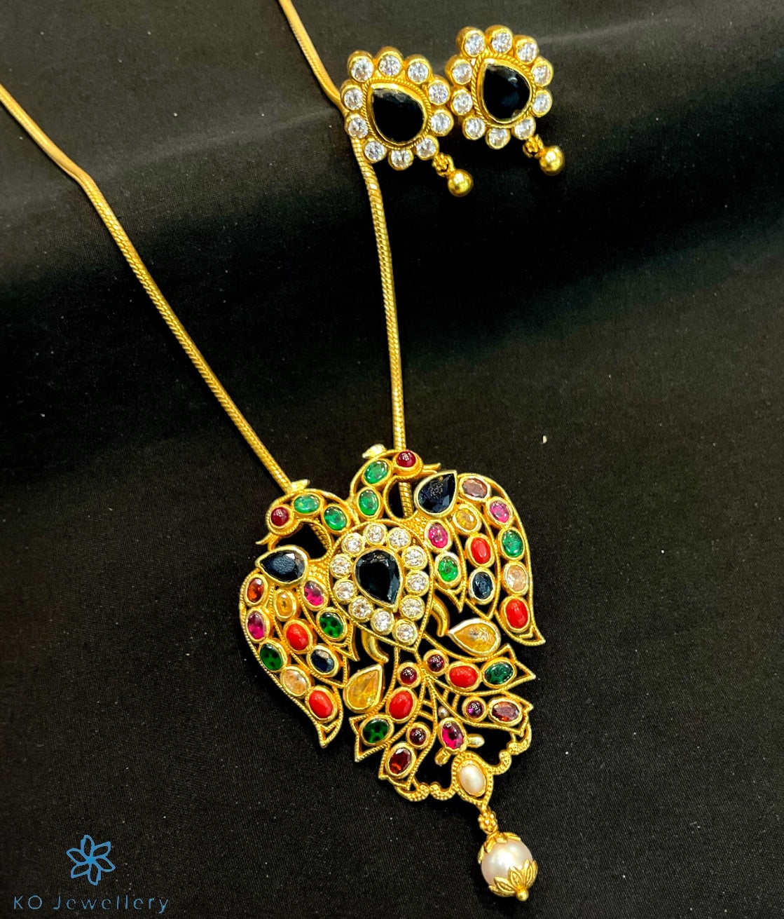 The Gandaberunda is a mythical two-headed bird used as a royal emblem of the Mysore royal family, it forms the main motif here. The sheer intricacies of design and flawless craftsmanship make this pendant special. Handcrafted using techniques from ancient South Indian antique jewellery this piece is studded with navratna gemstones. All pieces in this collection are crafted in Sterling (92.5) Silver and gold-dipped in a special process to give them an antique look.