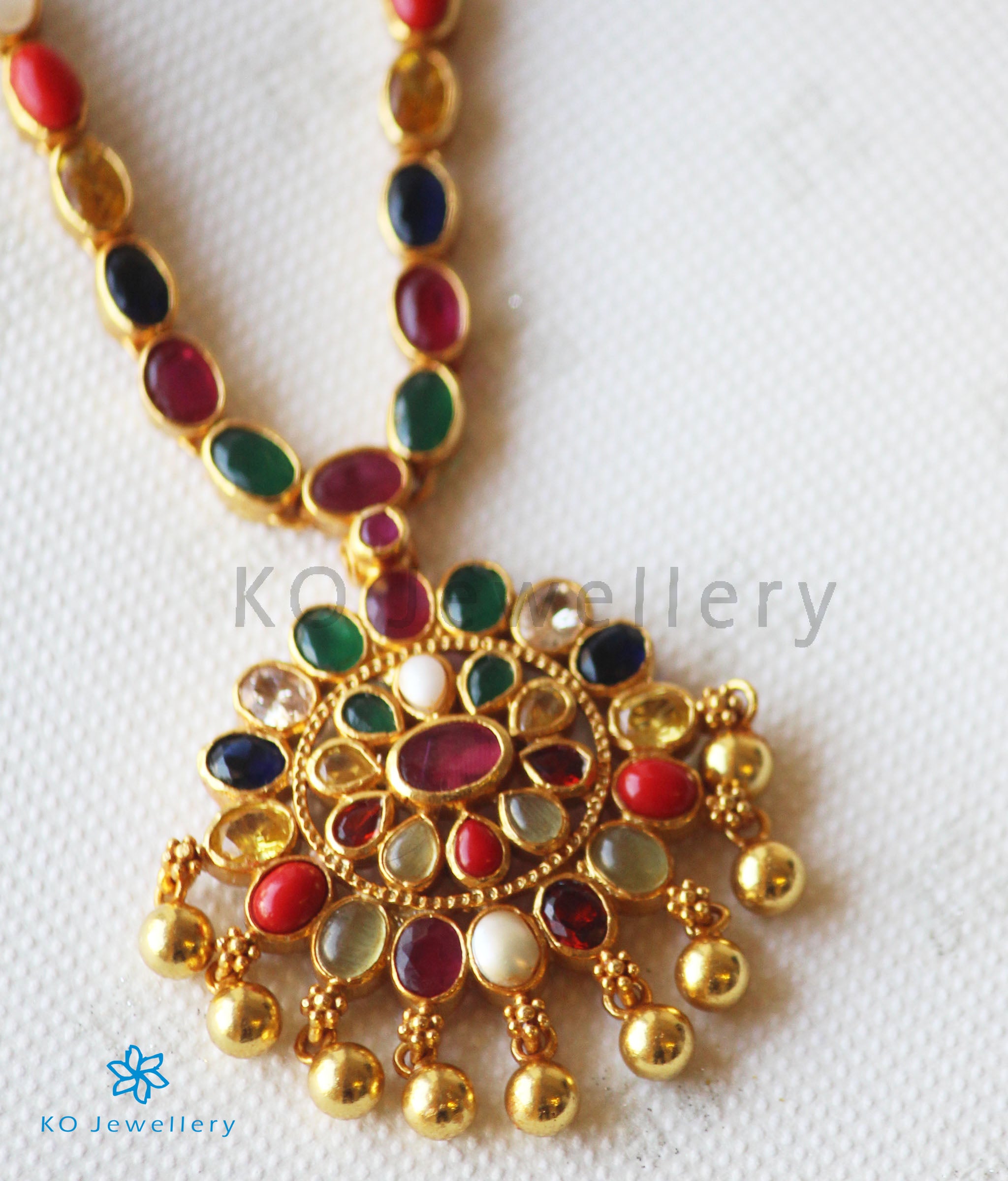 A gorgeous pendant set with Navratna gemstones sits at the center of this sterling silver (92.5%) necklace. Fully handcrafted using techniques used in ancient South Indian antique gold temple jewellery this a striking piece of jewellery.It comes with matching earrings.