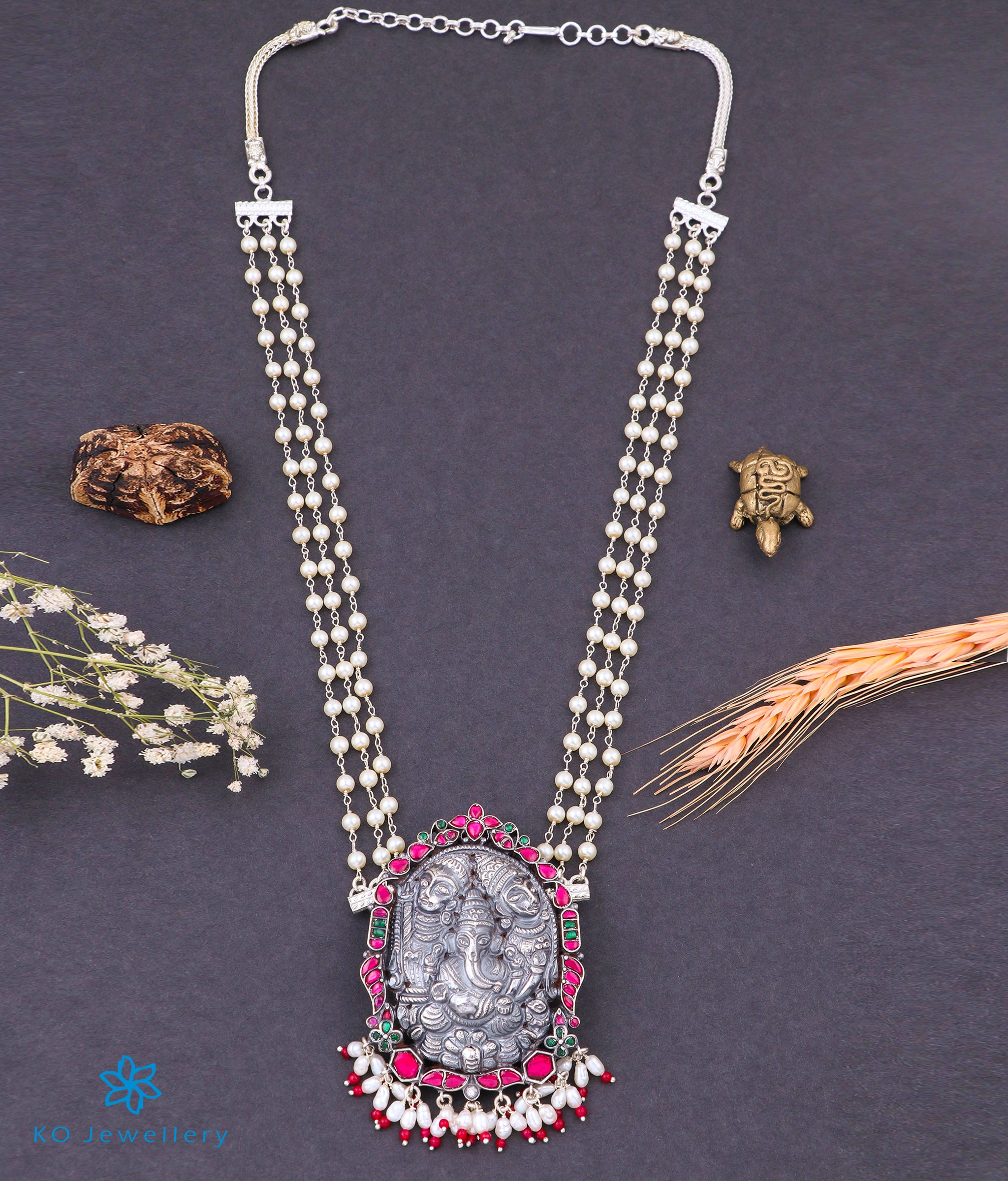 Feel like a modern day princess with this oxidised sterling silver (92.5%) necklace with Lord Ganesha at its center; crafted in the ancient kundan-jadau tradition of jewellery. Meticulously handcrafted by skilled artisans, this exquisite design captures the serene beauty of Lord Ganesh, the intricate detailing is beautifully depicted in sterling silver. The elaborate design is studded with red and white polki stones and decorated with strings of pearl . The entire piece is crafted in pure silver and oxidised.