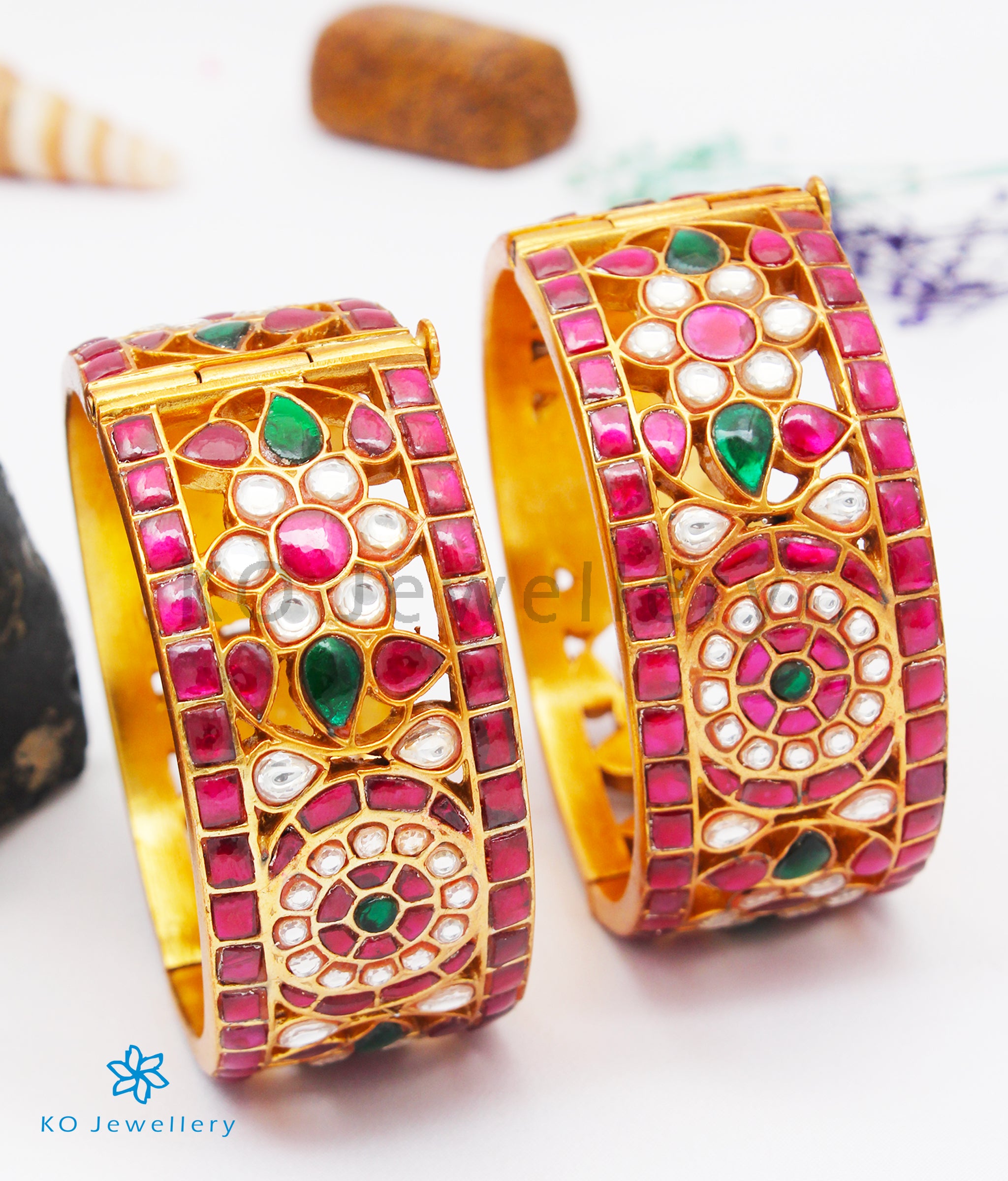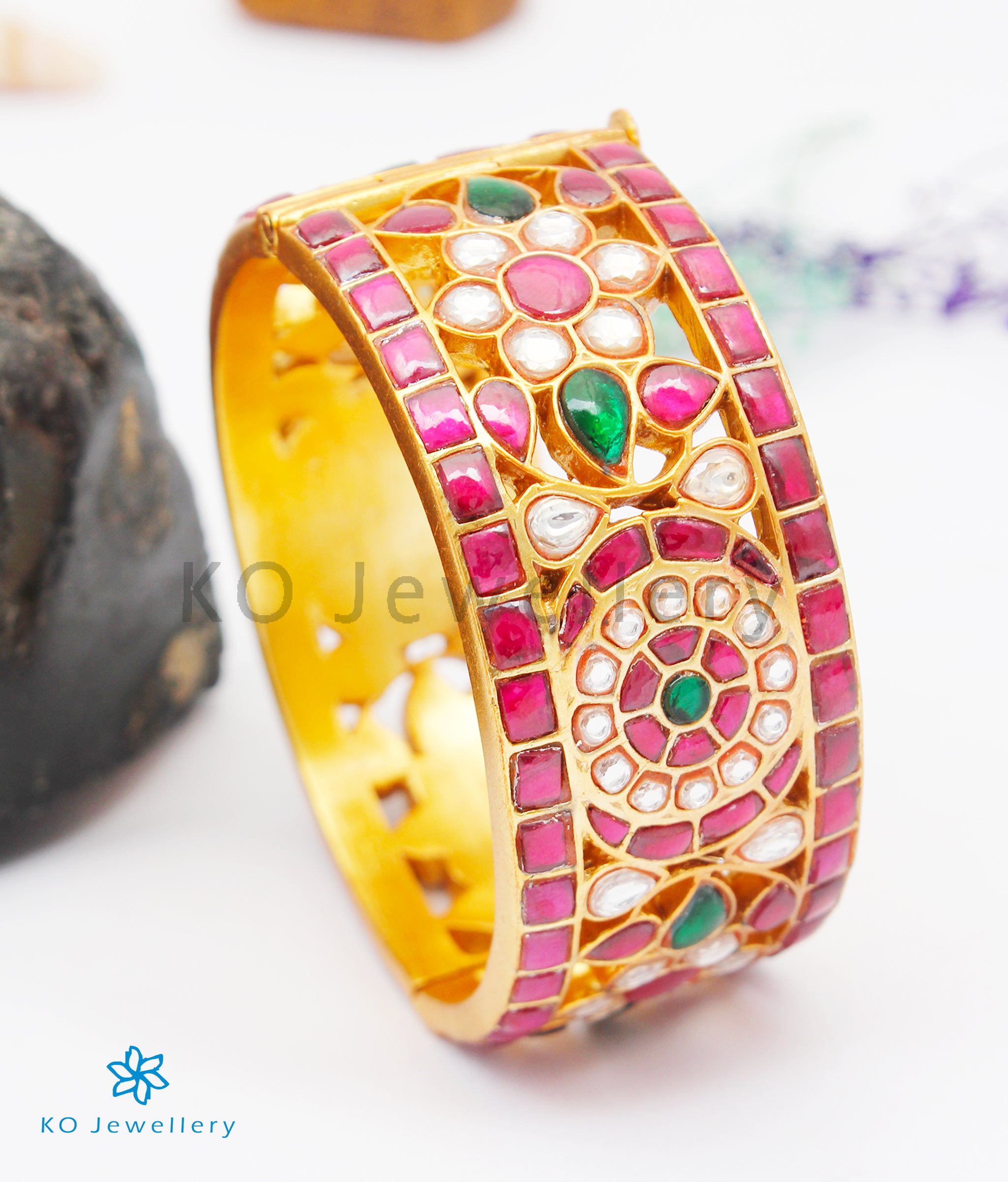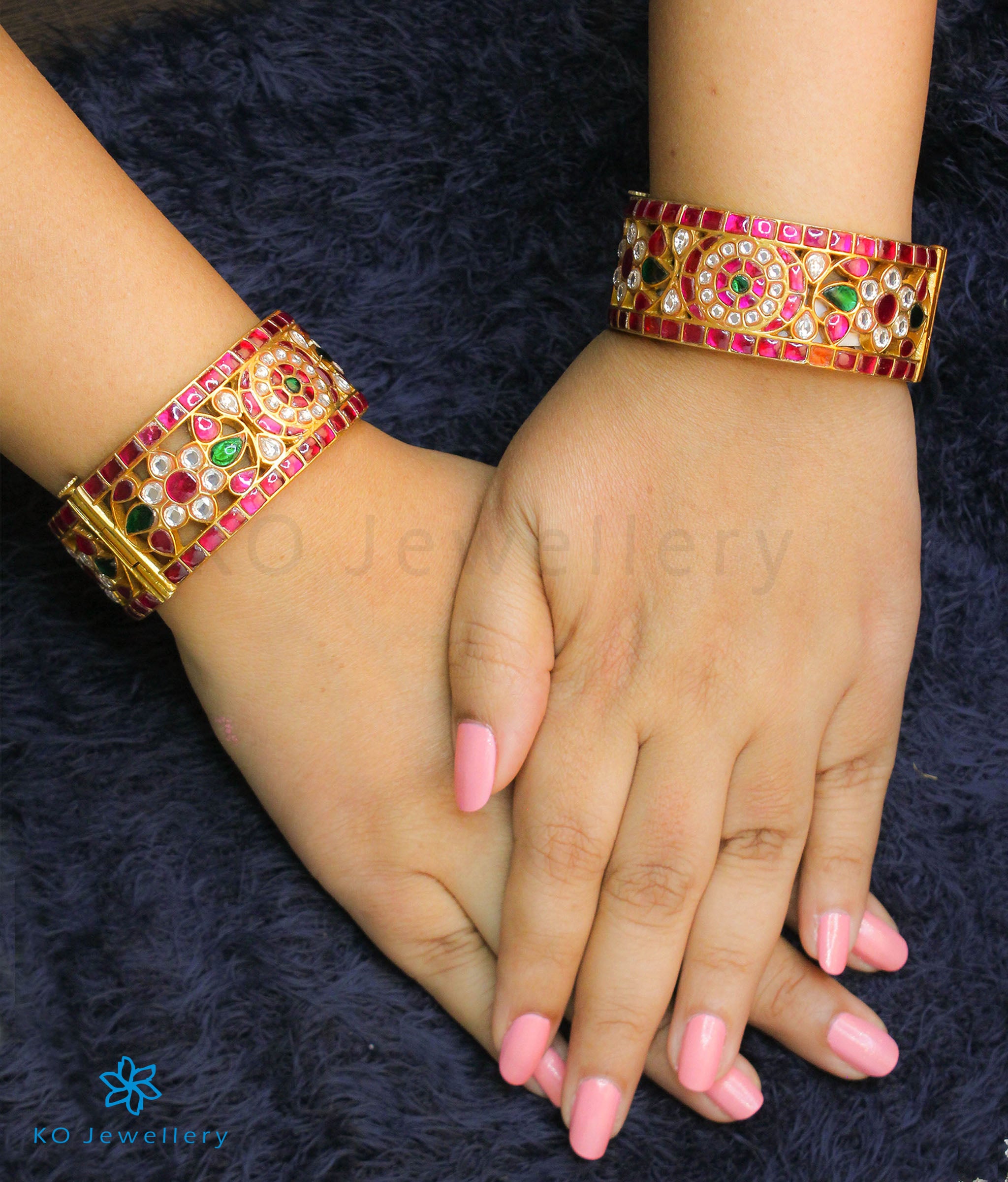 An impeccable Sterling Silver (92.5%) bracelet with an intricate design crafted with the 'kundan-jadau' technique and dipped in gold. Recreate the romance of royalty when you wear this exquisite bracelet that displays superior craftsmanship and an eye for detail. This seamlessly handcrafted bracelet comes with a screw and can be opened to gently fit your hand. You could choose to buy it single or in a pair. The price listed is for a single bracelet.