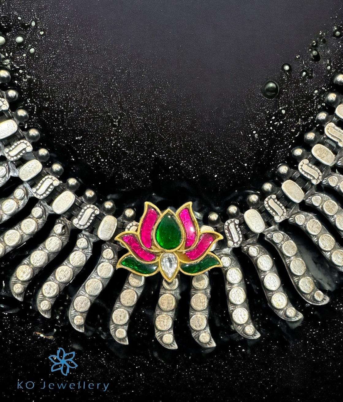 Flaunt a silver necklace that represents a fusion of ethnic design, contemporary aesthetics and excellent craftsmanship .The necklace has a beautiful Lotus motif pendant finely detailed with polki stones. The entire necklace is handcrafted in sterling silver (92.5%) and makes for a beautiful accessory. It comes with matching earrings and the price given is for necklace & earrings both.