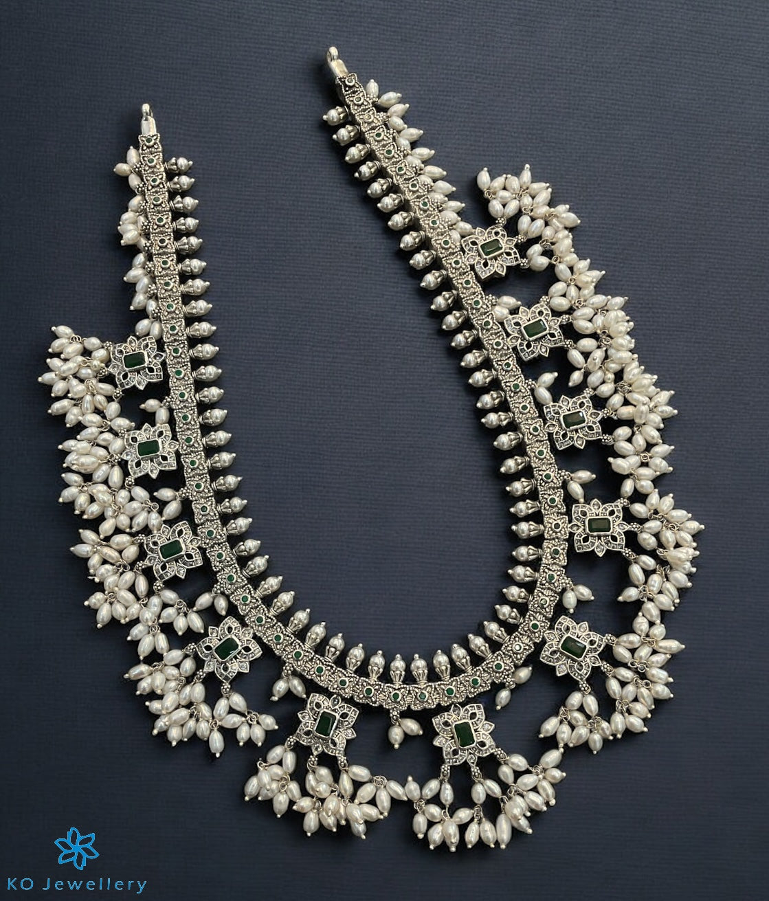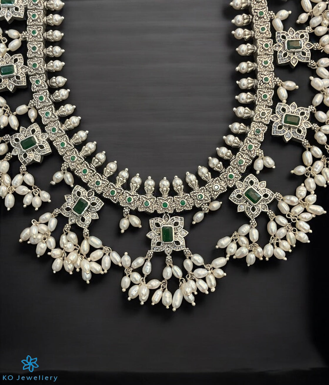 If you want to stun everyone with a bespoke piece of jewellery this is the design for you. This heritage necklace carries pendants with green kempu stones and is decorated with natural Pearl.