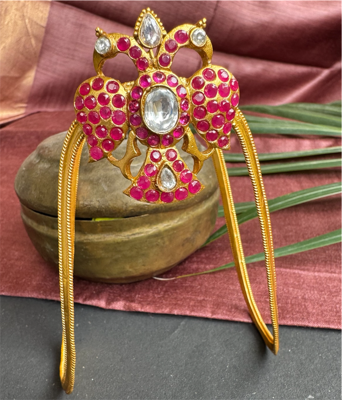 A heirloom statement piece, and a KO original design this is a stunning Vanki . A gorgeous recreation of a classic heritage design, this Vanki (armlet) features the powerful Gandaberunda motif, symbolizing strength and protection. An exclusive KO original, the piece is handcrafted using ancient South Indian jewelry techniques in Sterling (92.5%) Silver and finished with a special gold-dipped process to create a rich antique look. The iconic V-shape ensures a comfortable, adjustable fit for any arm size while the redand white polki stones add a stunning look. A timeless expression of tradition, craftsmanship, and enduring beauty.
