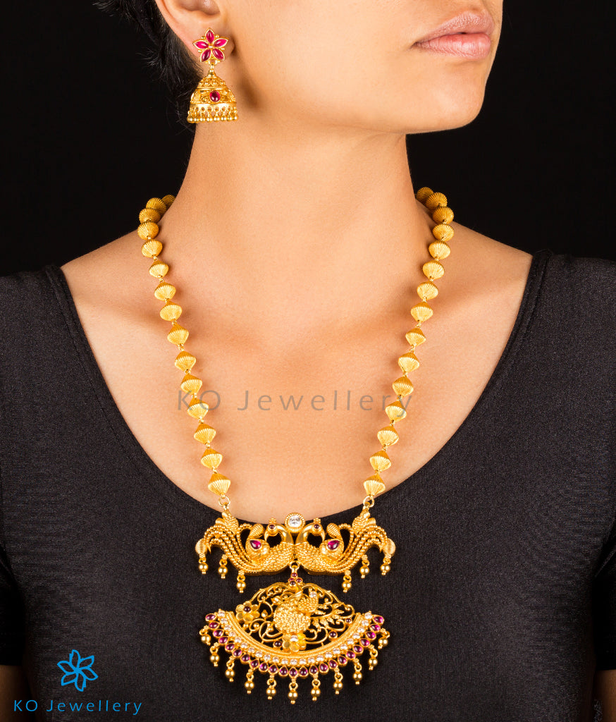 Embrace timeless elegance with this ornate peacock motif necklace, a stunning piece of traditional temple jewellery. The pendant, handcrafted from 92.5 sterling silver, features a graceful peacock design adorned with vibrant Kempu stones, symbolizing beauty and prosperity. The necklace string is made of gold-dipped silver beads arranged in an intricate pattern, enhancing its regal charm. Finished with a special antique gold dip, this masterpiece blends heritage artistry with enduring sophistication — perfect for festive and bridal occasions.