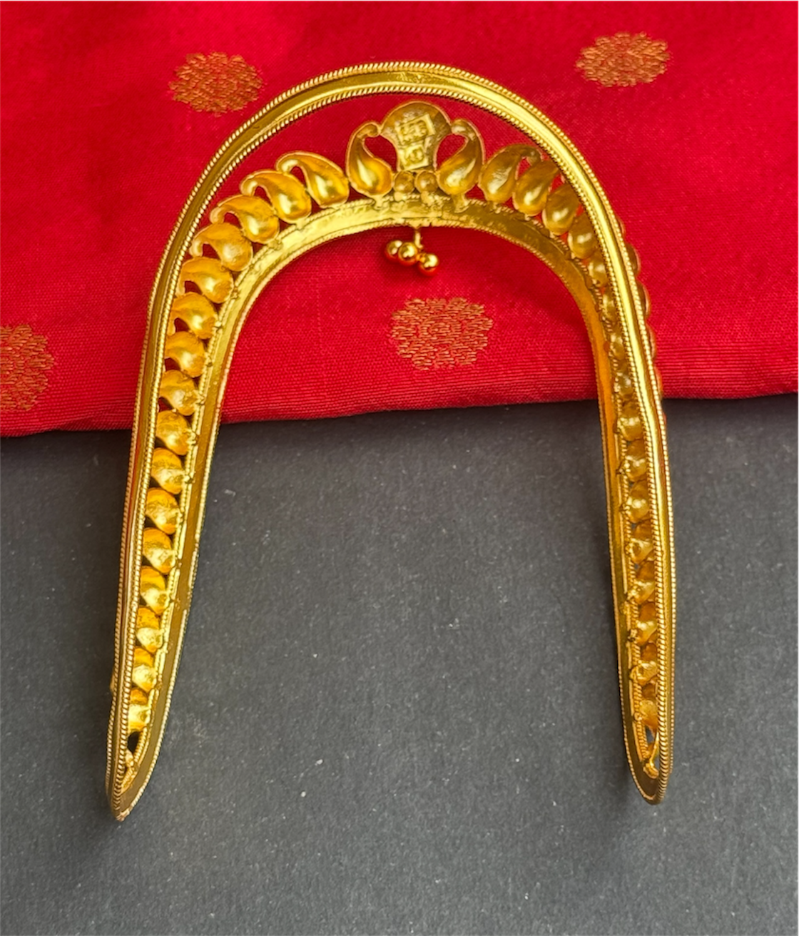 Our latest creation honors this ancient South Indian tradition. Handcrafted in 92.5 Sterling Silver and dipped in 24k gold for that authentic antique glow, it features the "Manga" (paisley) motif—a timeless emblem of elegance.