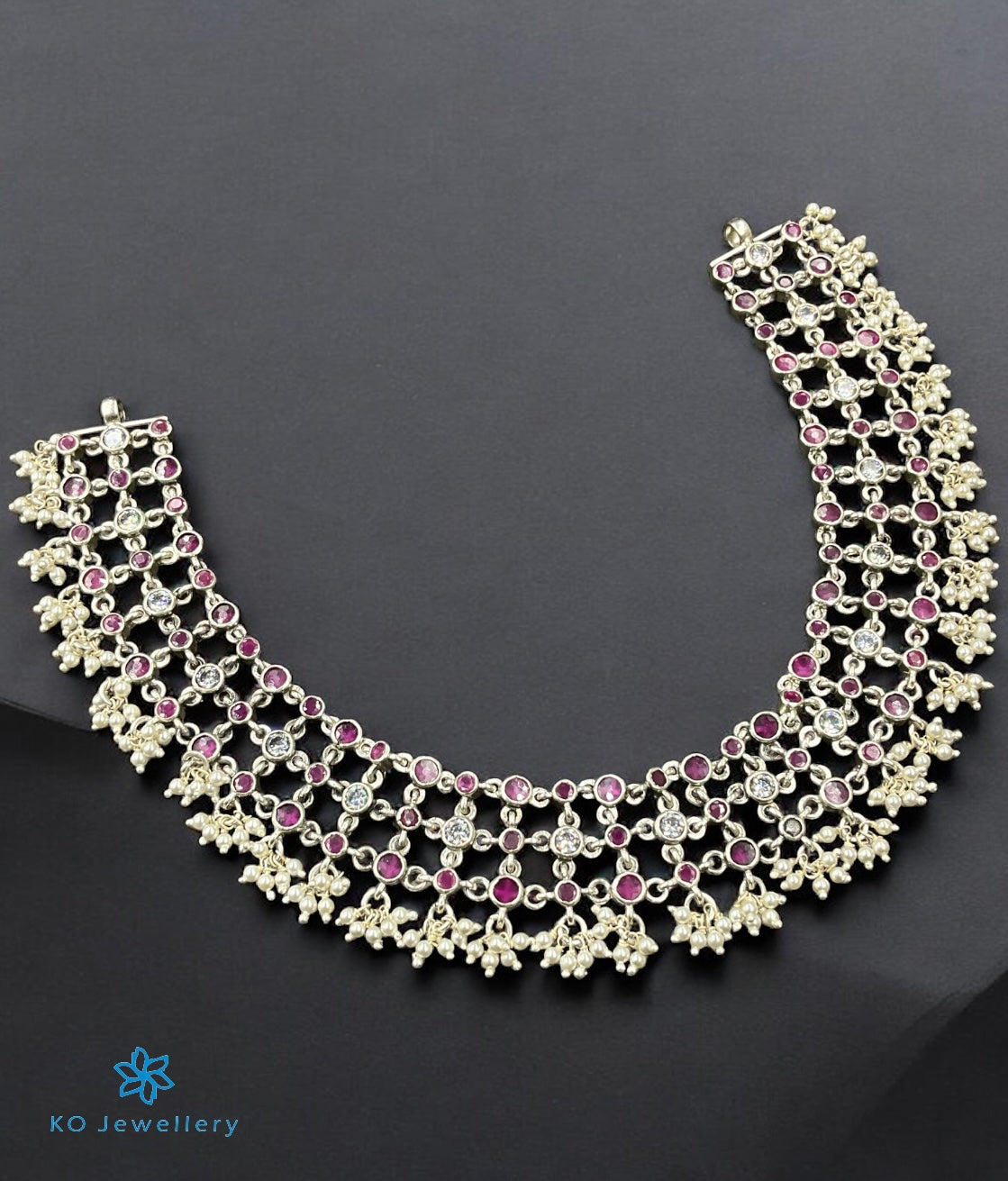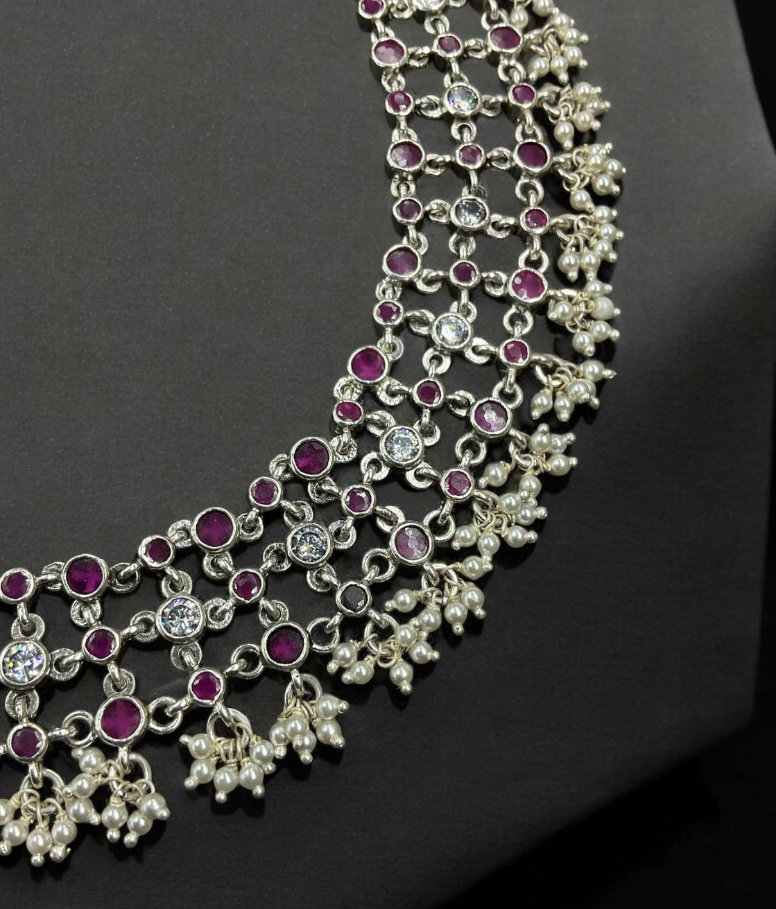 Embrace the elegance and spiritual beauty of traditional Indian jewellery with this Gorgeous Temple Jewellery Style 925 Silver Handcrafted mesh Necklace in a unique design. This stunning piece is a perfect blend of heritage and luxury, crafted from high-quality 925 sterling silver and lightly oxidised for a timeless finish. Featuring vibrant Kemp stones and premium natural cultured Pearl, this necklace makes an ideal accessory for weddings, festivals, and other special occasions.
