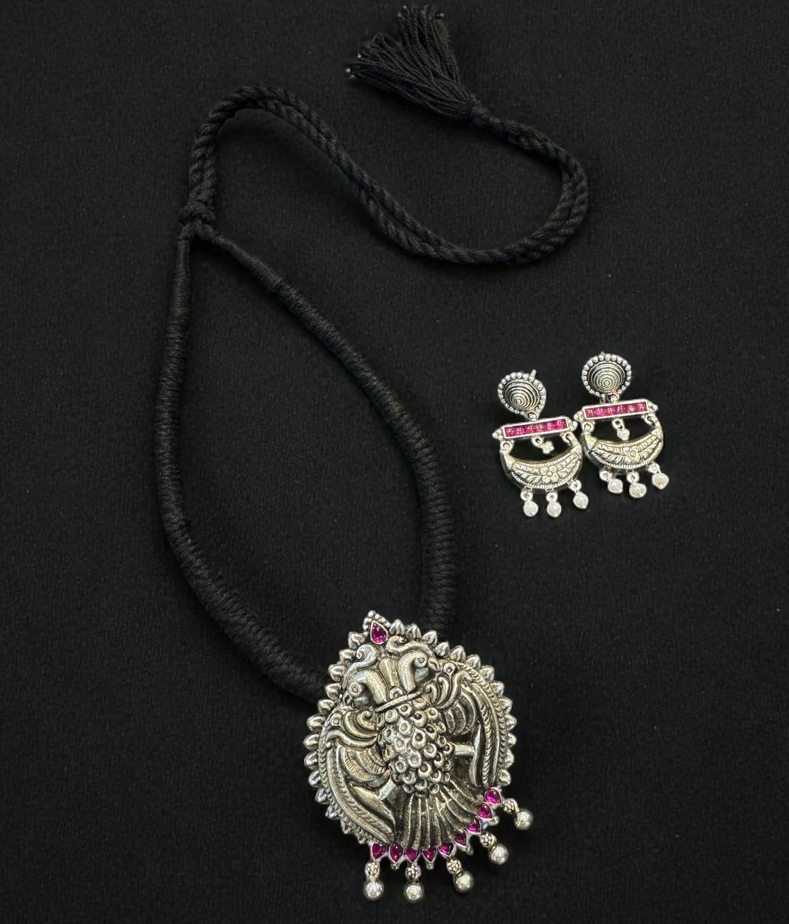 The Suvrata Silver Gandaberunda Thread Necklace & Earrings (Oxidised)