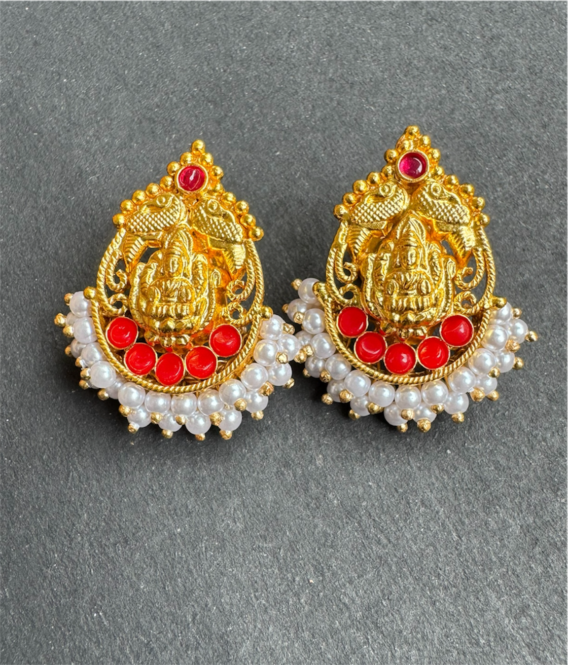 The Svarna Silver Lakshmi Pearl Earrings (Red) - Buy Antique Temple silver jewellery online - KO Jewellery