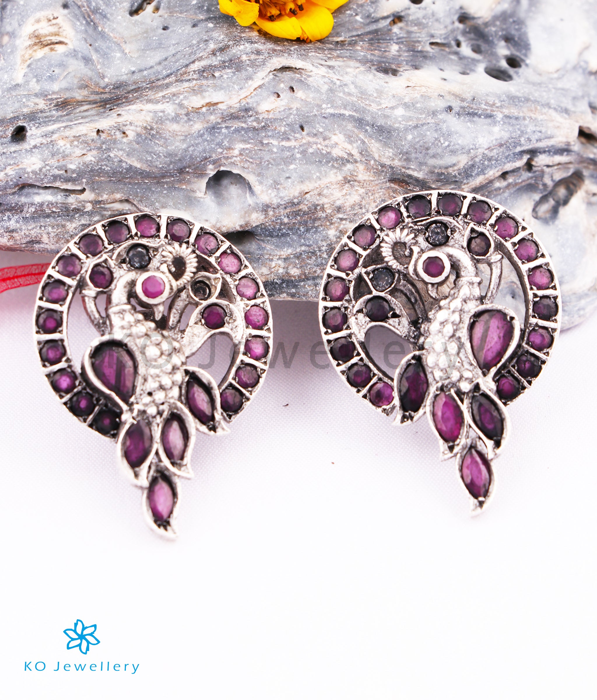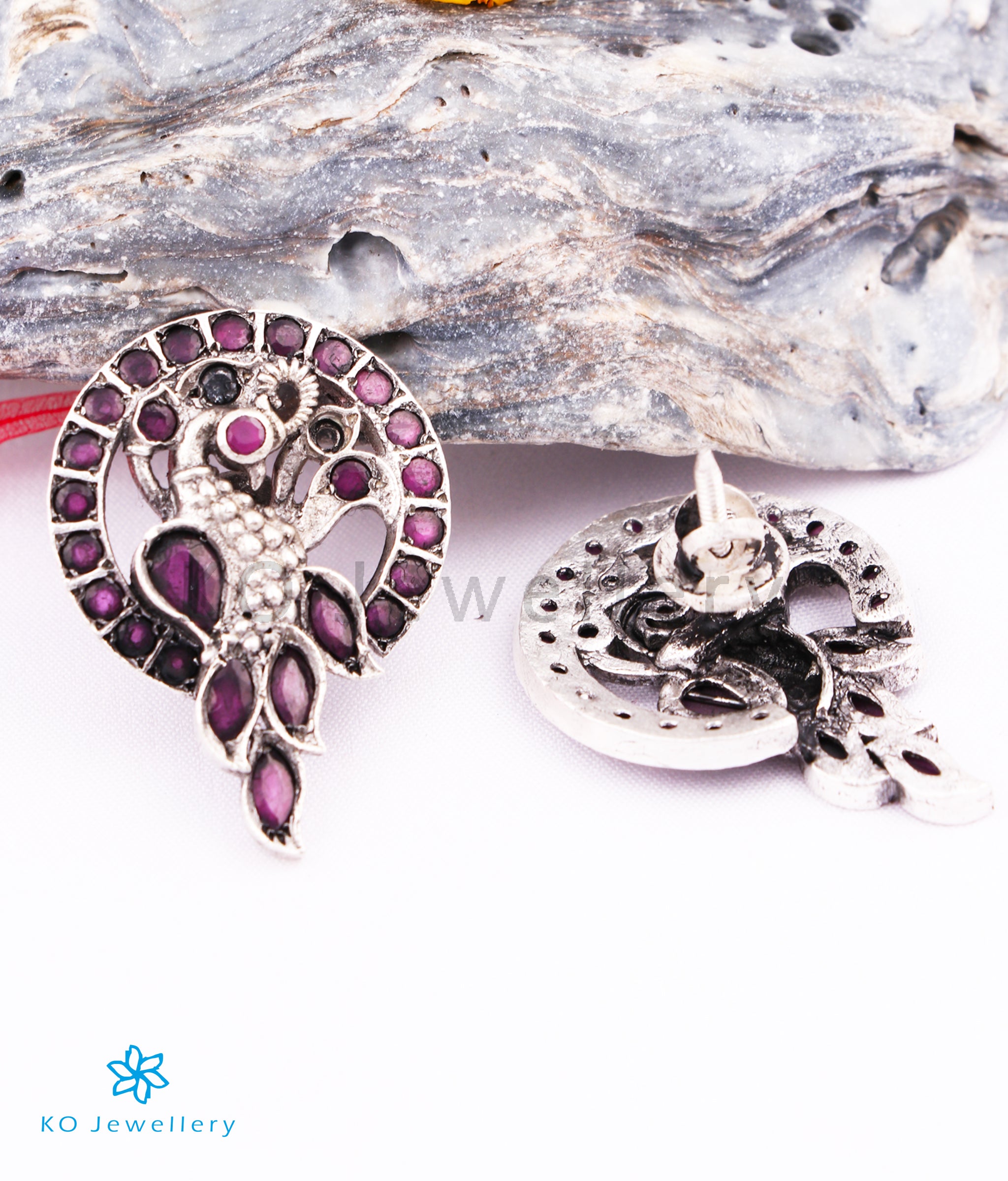 Stunning and gorgeous in design, this is an impeccably handcrafted pair of peacock motif, kempu earstuds in Sterling Silver (92.5%) which has been oxidised. This pair of earrings comes with with the bombay screw closure