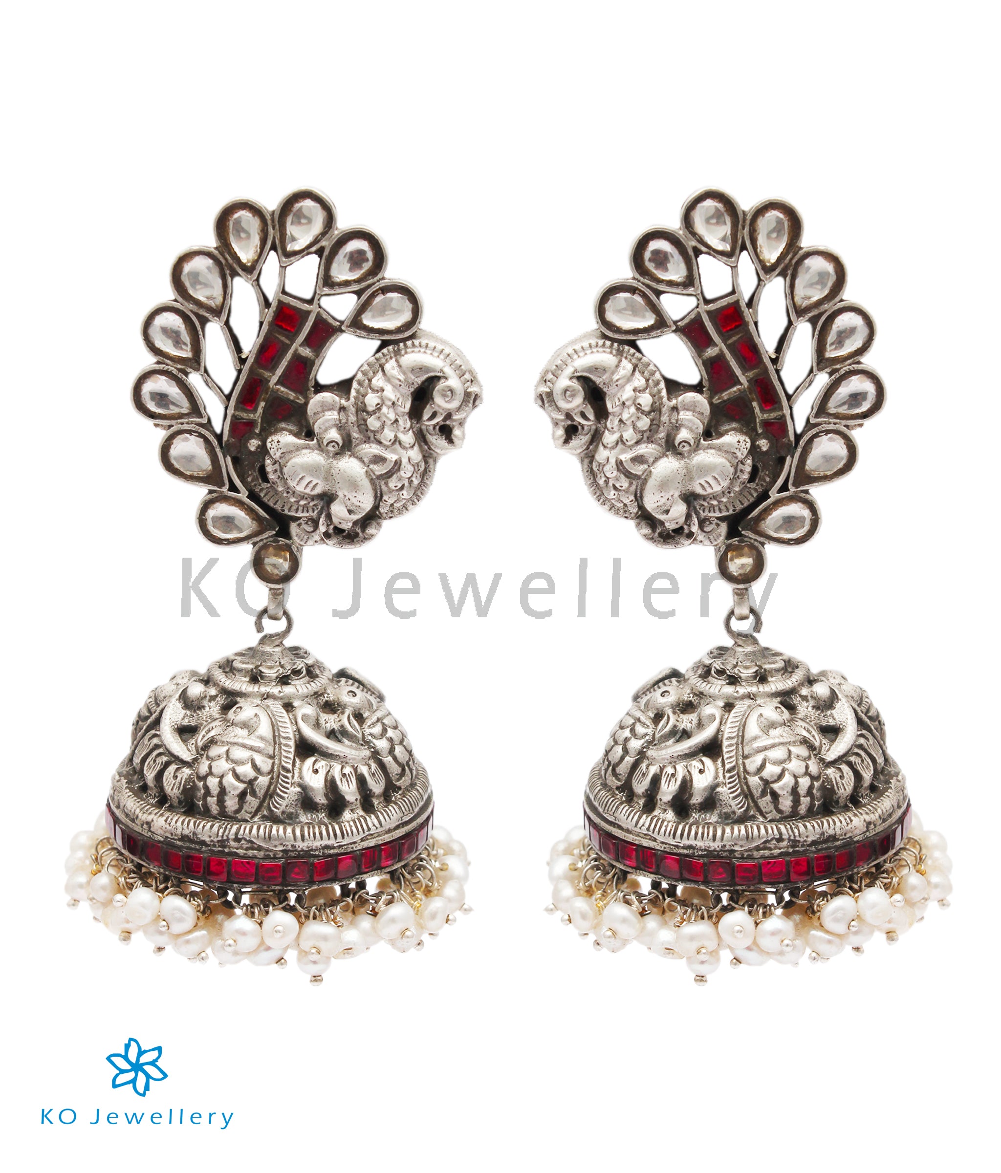 A real showstopper of a jhumka ,this pair will surely steal all the attention. The ornate and impeccably handcrafted two layered jhumka is topped by two gorgeous twin peacocks . Handcrafted using techniques used in ancient South Indian antique gold temple jewellery the entire piece is crafted in Sterling Silver (92.5%) silver and oxidised.