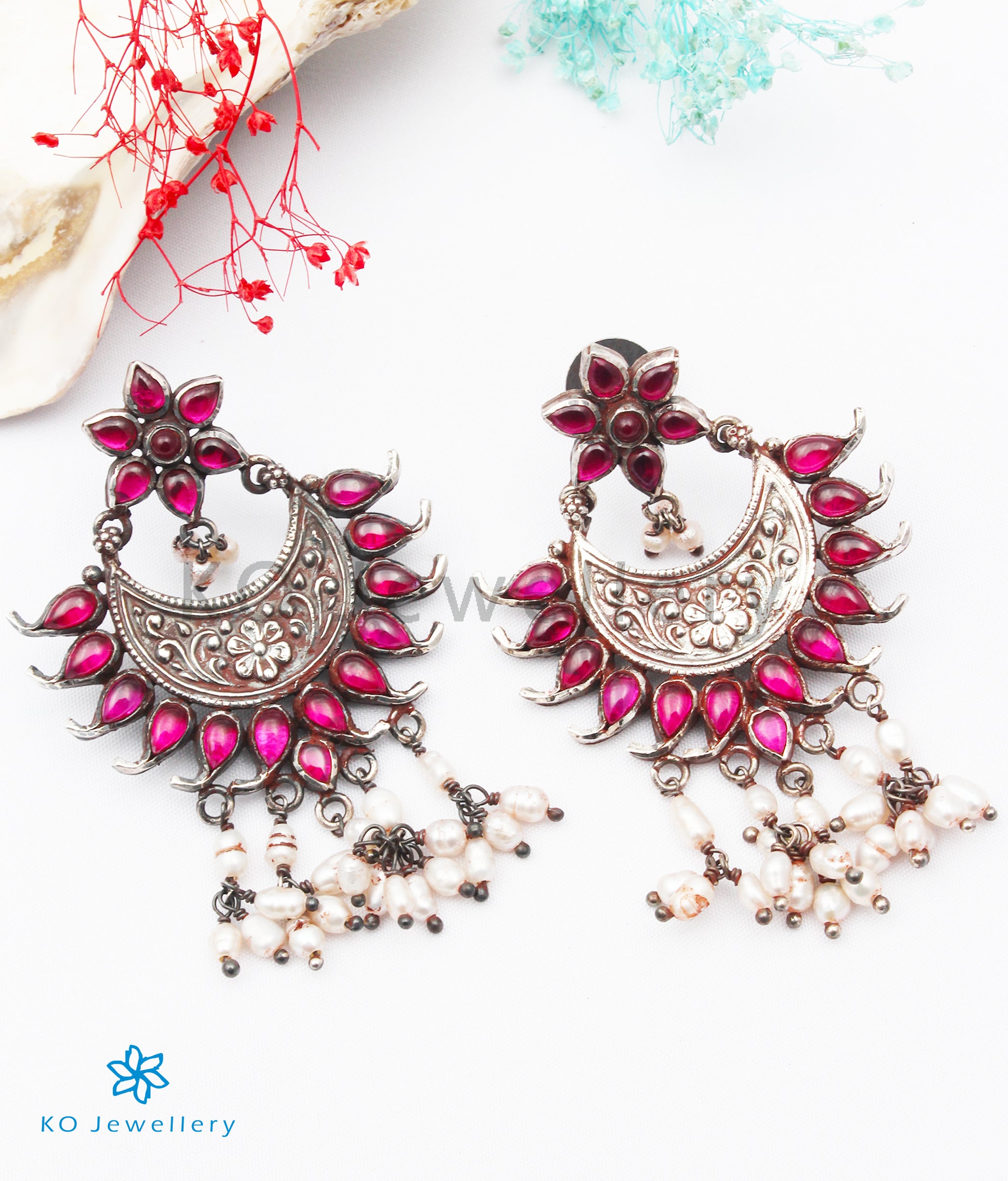 An attractive pair of silver earnings in the much-loved chand-bali design that complements all kinds of traditional wear beautifully. The earring has been lovingly handcrafted in Sterling Silver (92.5%) with techniques used in ancient South Indian antique temple jewellery. The kempu stones and the dark oxidisation done gives this pair an antique look.
